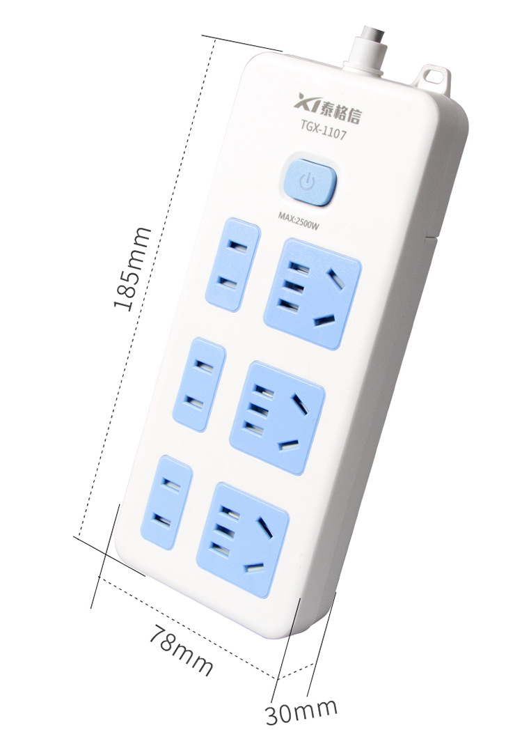 品牌: 泰格信 额定电压: AC250 应用范围: 家用,办公,工地 导电体材质: 铜 外壳材质: ABS 额定频率: 50/60HZ 额定功率: 2500 外形尺寸: 78*30*185mm 质保: 5年 标准类型: 新国标