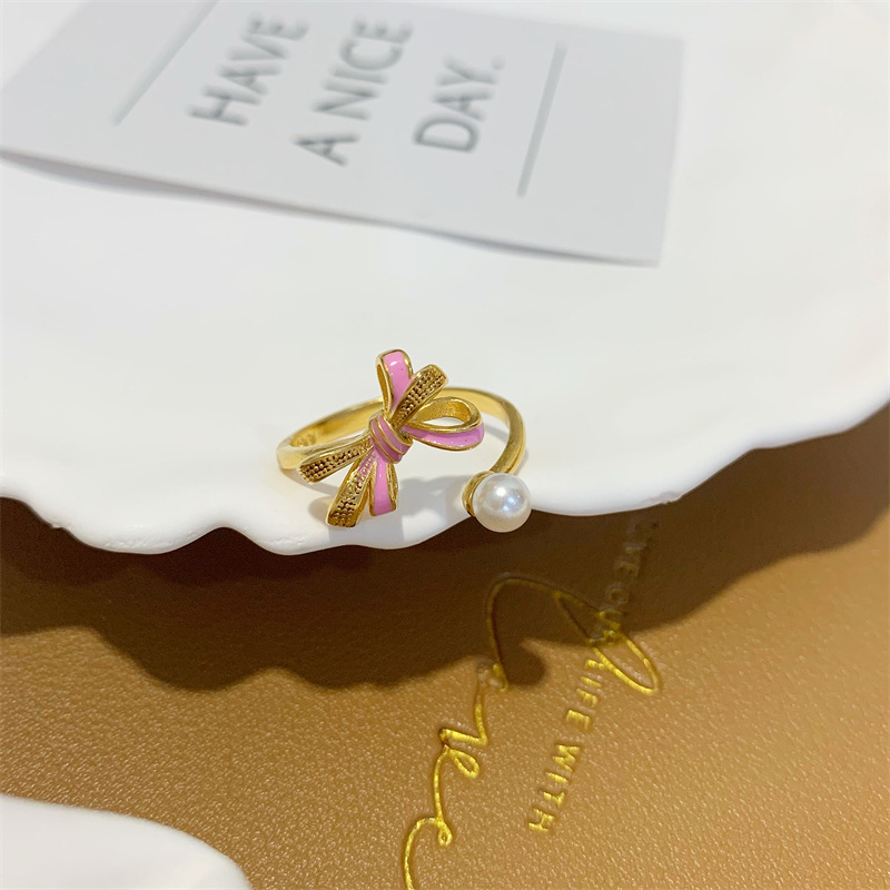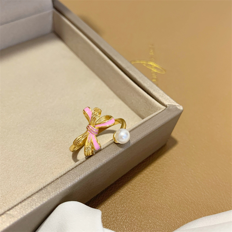 蝴蝶结戒指女ins风珐琅彩珍珠手饰品百搭开口食指戒指环久不掉色