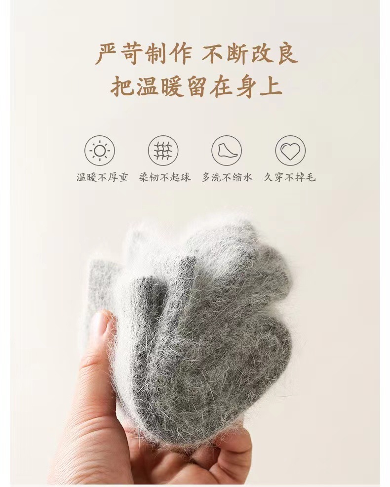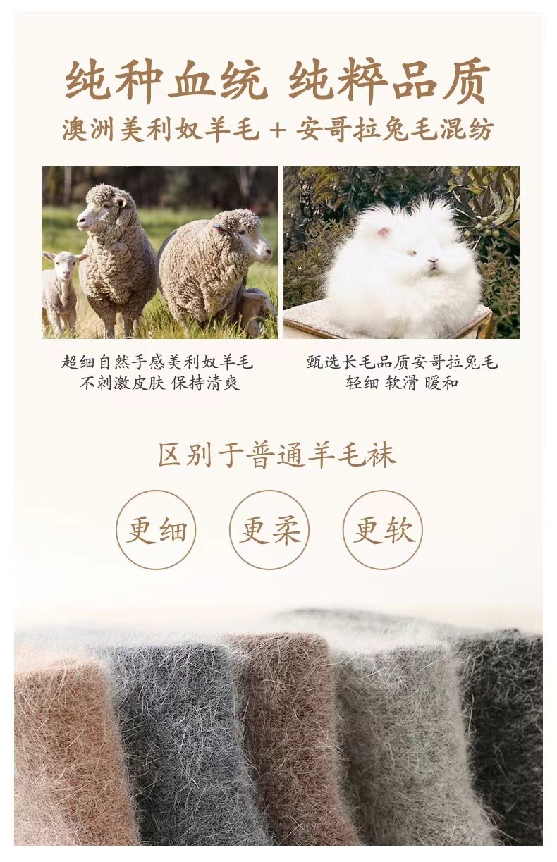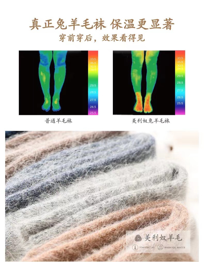 面料名称: 兔毛 无骨缝制: 否:机器缝头 功能: 吸汗,防臭,防摩擦 图案: 纯色 包装形式: 袋装 适用性别: 女 适用年龄段: 青年(18-40周岁),中年(40-60 主面料成分: 兔毛 筒高: 中筒 针数: 168N