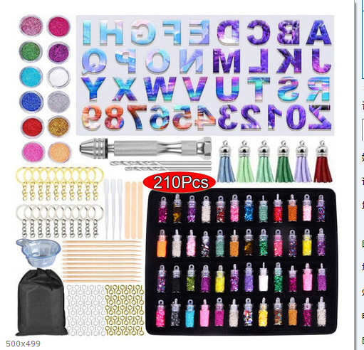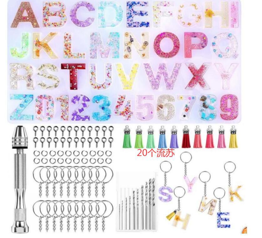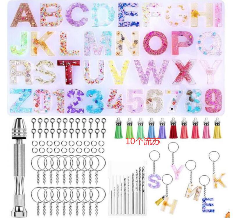 套装包含:正版字母硅胶模具*1、手捻钻*1、钻头*10、10mm羊角钉*100、8mm开口圈*20、钥匙圈*20、流苏吊坠*自定(如图10个颜色各2个)