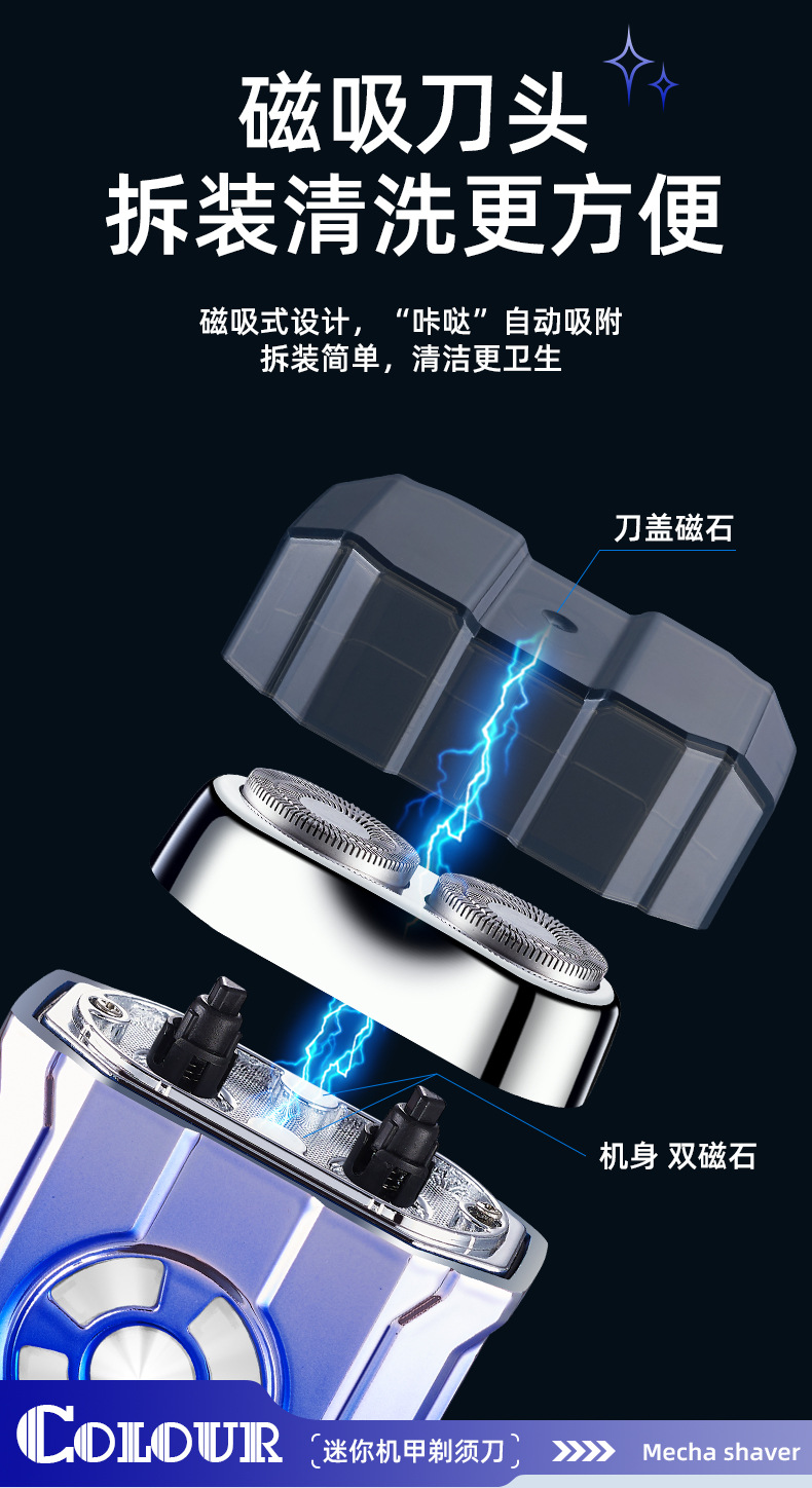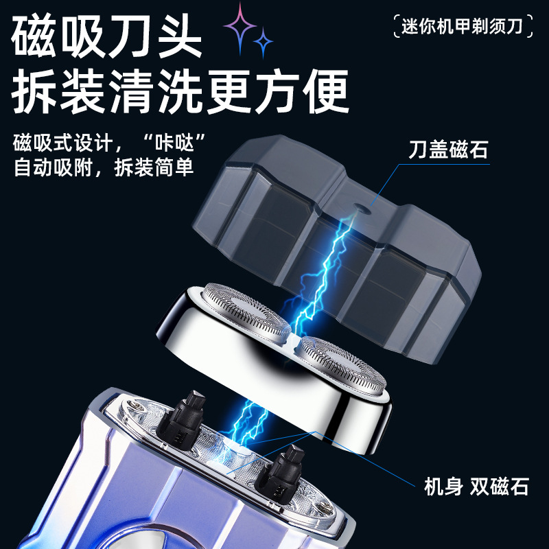 2. 吸磁式刀头,刀头拆卸方便,放在机身上可直接吸住,无需安装,清洗方便。