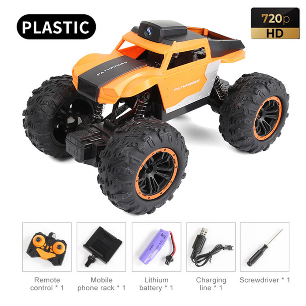 【功能描述】:2.4G频段无线遥控、抗干扰可多台独立控制、合金架构车身、减震弹簧及越野轮胎,仿真比例车型适配大多数场景地形。装载高清摄像头模块,搭配app软件可实现视频回传及手机界面操控,视频及图像均存储至手机中可随时查看,手势感应拍照"
