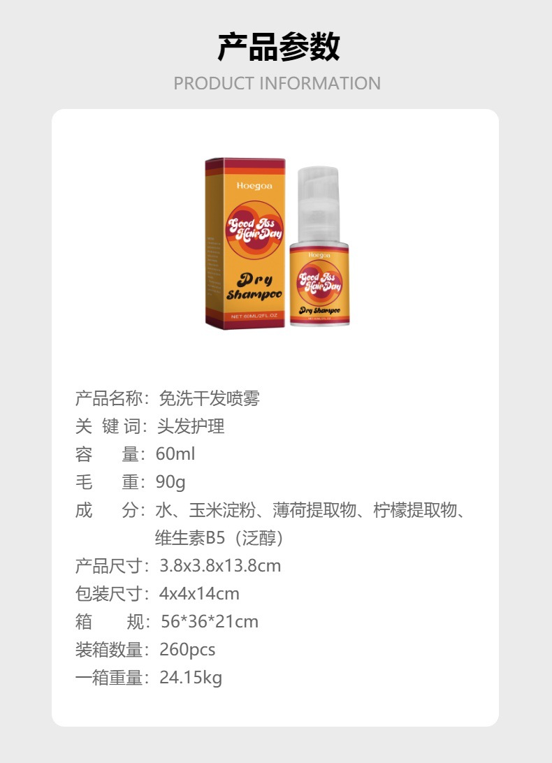 品牌: HOEGOA 功效: 头发干爽 品牌类型: OEM 箱装数量: 260pcs 是否进口: 否 货号: HG-A03-0271-01 是否跨境出口专供货源: 是 主要销售地区: 南美 主要下游平台: 亚马逊 颜色分类: 60ml(仅供外贸出口销售,禁止国内销售 重量: 0.1 kg/盒