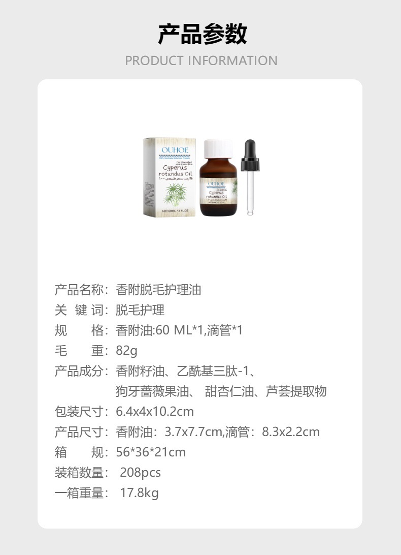 OUHOE香附脱毛护理油 植物精油温和护理光滑身体肌肤脱毛护理油专供出口 English | 投诉