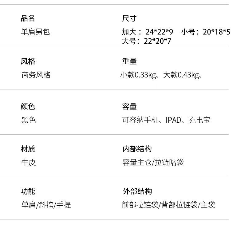 质地: 牛皮 风格: 休闲 闭合方式: 拉链 容纳电脑尺寸: 16英寸 里料材质: 涤纶(聚酯纤维) 重量: 0.5 kg/件 装箱信息:长宽高:30X40X50cm 装箱重量: 10KG 装箱数量:50pcs