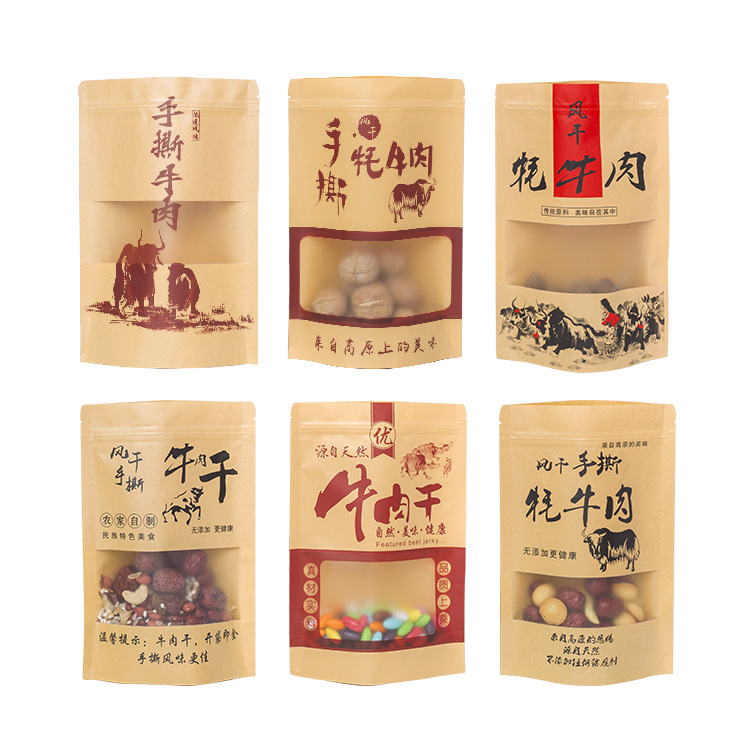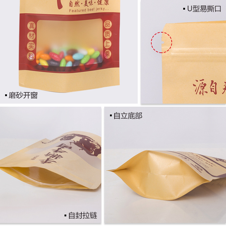 食品自立自封拉链密封风干手撕牛肉干包装袋现货定做开窗牛皮纸袋牛肉干包装袋手撕风干牛肉自封自立牛皮纸袋150克250g 现货100个
