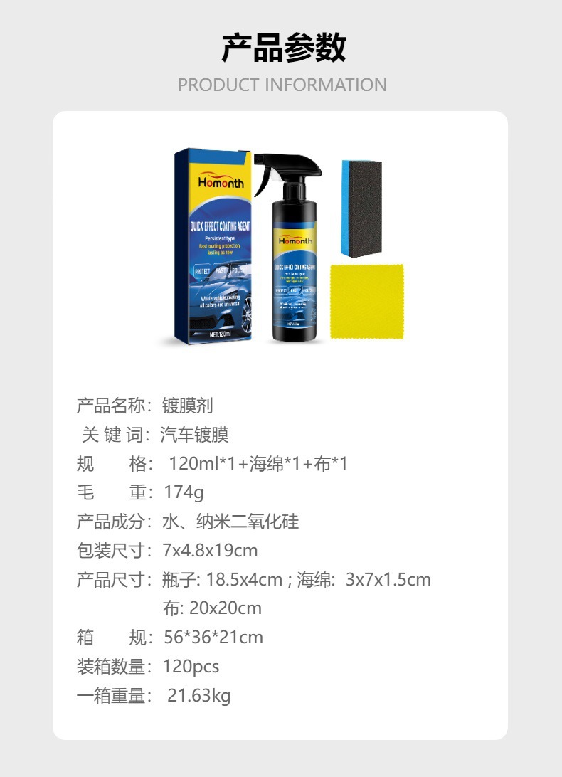 Homonth镀膜剂 车漆翻新增亮多功能汽车防尘去污清洁镀晶镀膜剂专供出口 English | 投诉