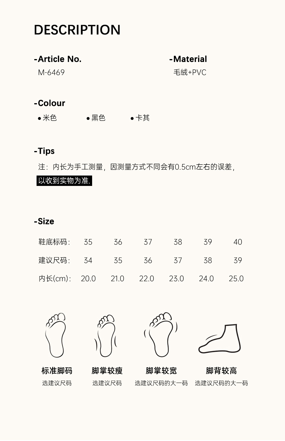 《批发须知》1:本公司所有产品自系统显示签收之日起七天内支持退货,超出七天不予支持 2:在快递显示签收之日起15天内,在产品无拆封不影响二次销售的情况下支持换货 3:官方活动包邮产品,若客户无理由退换货,需承担包邮运费以及退货运费 4:产品外包装有少许污渍,不属于质量问题,因快递途中多多少少会有些摩擦,但不影响 产品质量 5:产品若有些许异味,不属于质量问题,新鞋子没有穿戴过避免不了少许的异味,但是不影响健康 6:若收到货物后有质量问题或者少货的情况下,买家需自签收之时12小时内与卖家取得联 系核查情况,超出时间范围需买家承担责任 7:若旺期因快递因素导致客户延迟收货,与卖家无关8:链接价格未含税,开票另加税点,详细咨询客服