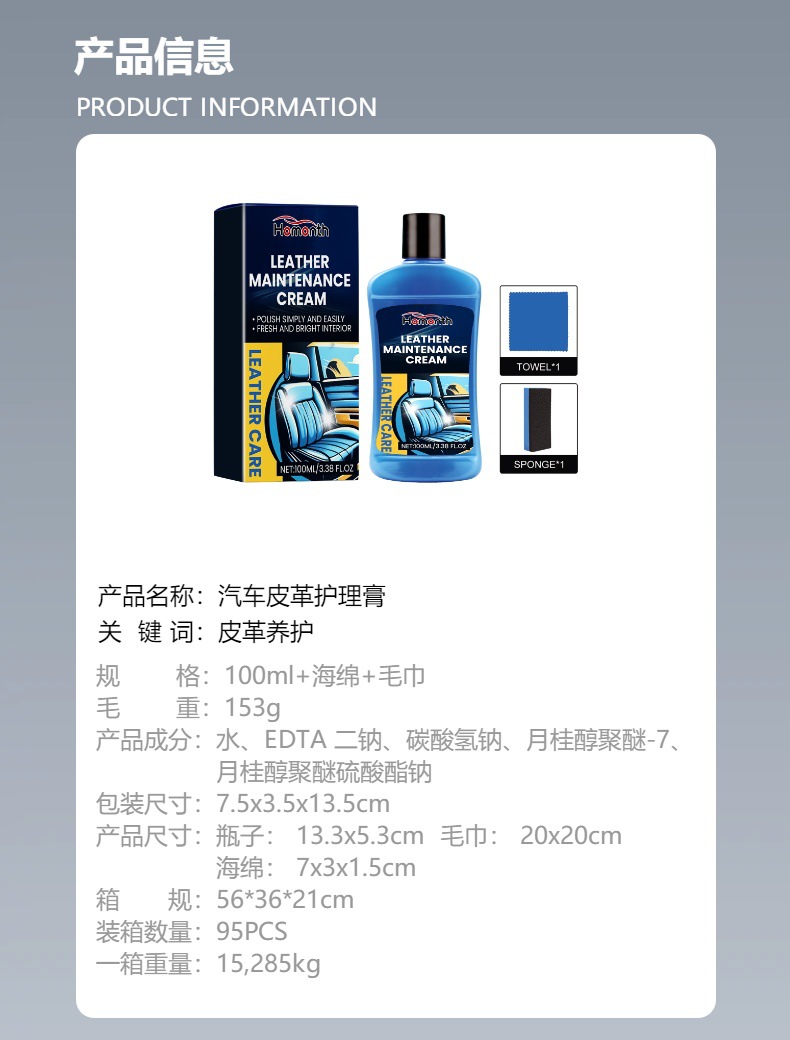 Homonth汽车皮革护理膏 汽车座椅沙发皮革清洁污渍翻新上光清洗剂专供出口 English | 投诉