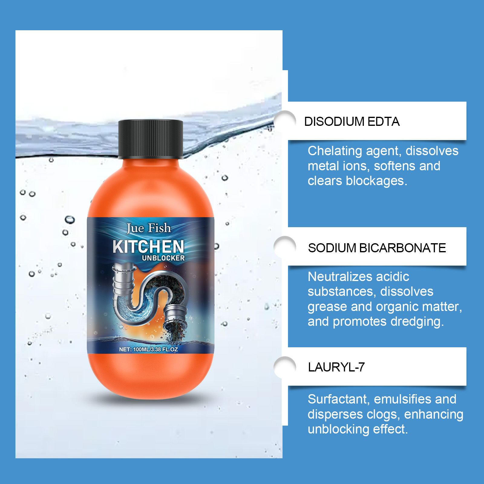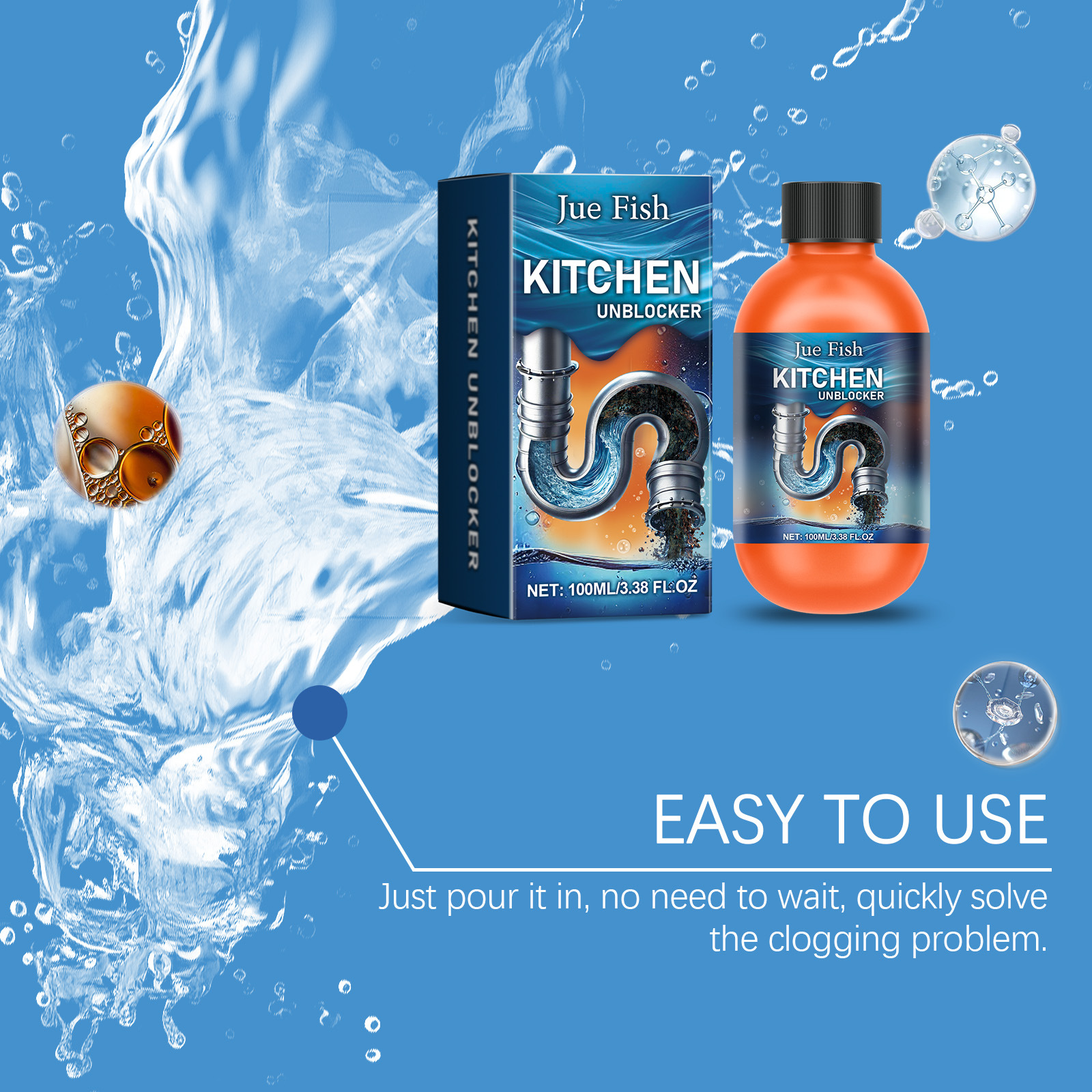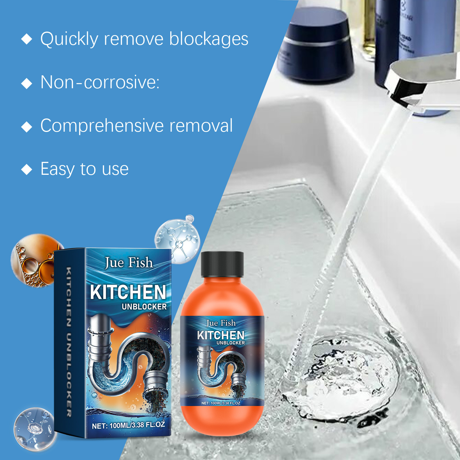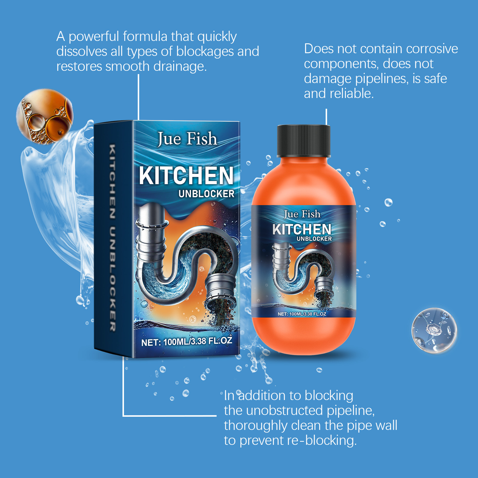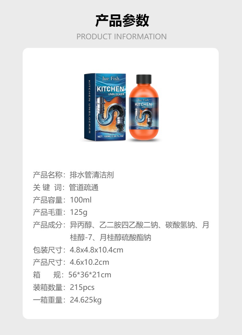 JUE-FISH 排水管清洁剂 家用厨房厕所水槽排水管快速疏通清洁剂专供出口 English | 投诉