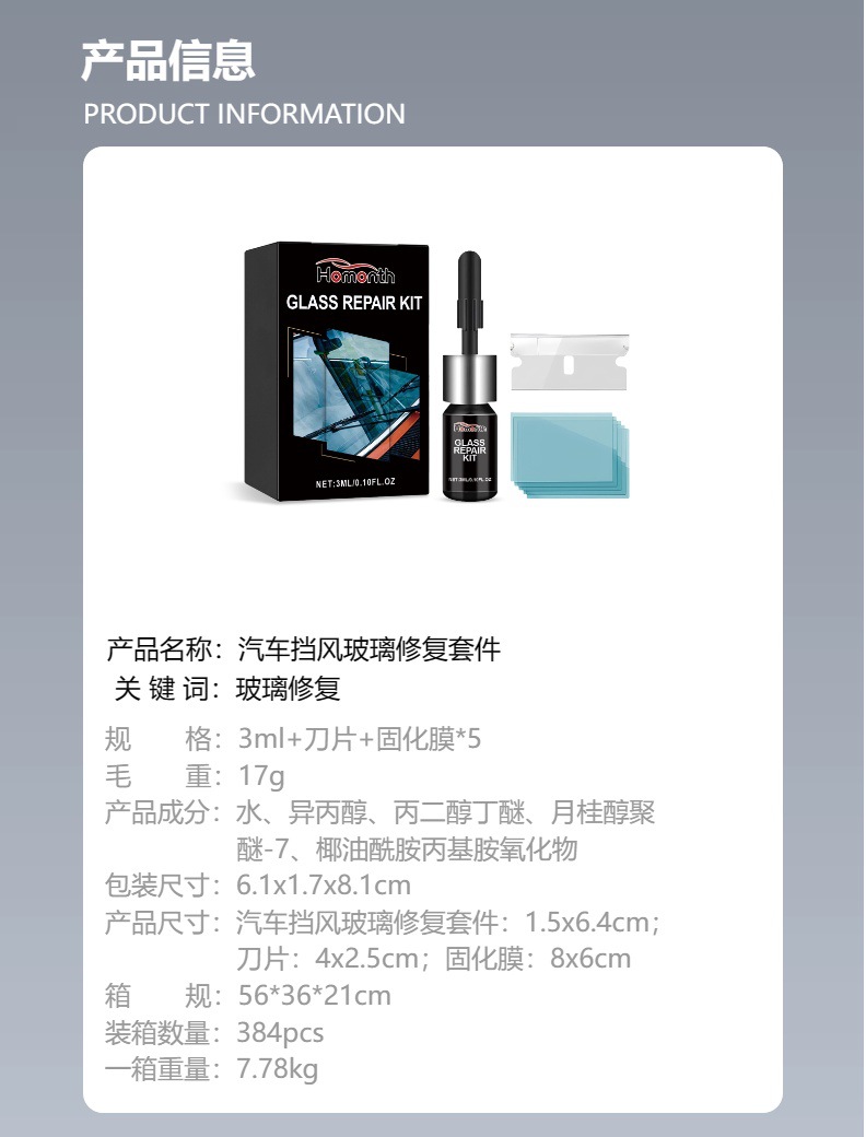 Homonth汽车挡风玻璃护理套件 车用玻璃裂痕划痕多功能粘合修补液专供出口 English | 投诉