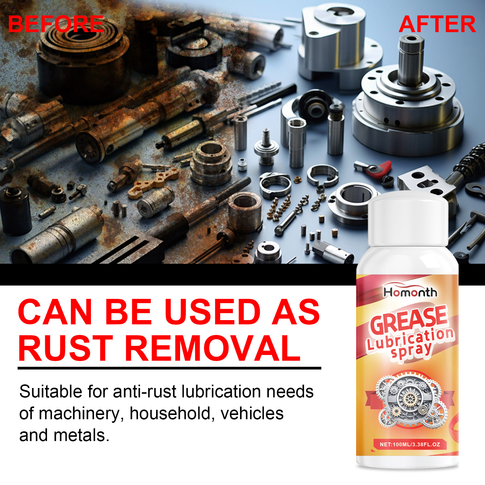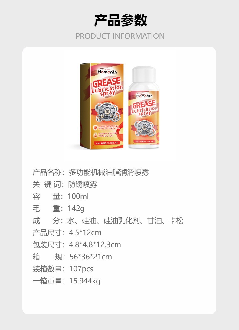 Homonth多功能机械油脂润滑喷雾 家用机械齿轮锁芯合页门防锈喷雾专供出口 English | 投诉