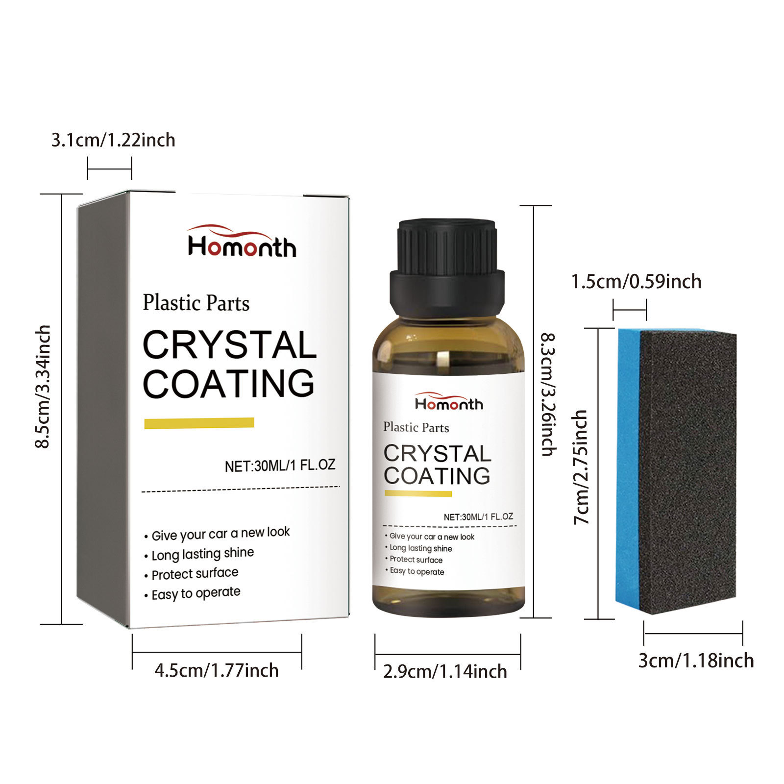 品牌: Homonth 加工定制: 否 类型: 汽车翻新剂套件 主要成分: 其他 保质期: 三年 执行质量标准: 合格品 货号: HME02-A005-1-WH1 颜色分类: 30ml+海绵 主要下游平台: LAZADA 主要销售地区: 欧洲 重量: 0.1 kg/瓶