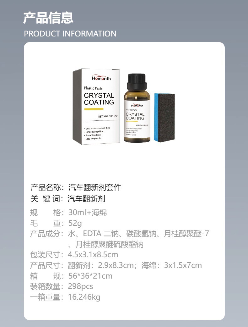 Homonth汽车翻新剂套件 汽车内饰仪表盘表板蜡塑胶清洁翻新镀膜剂专供出口 English | 投诉