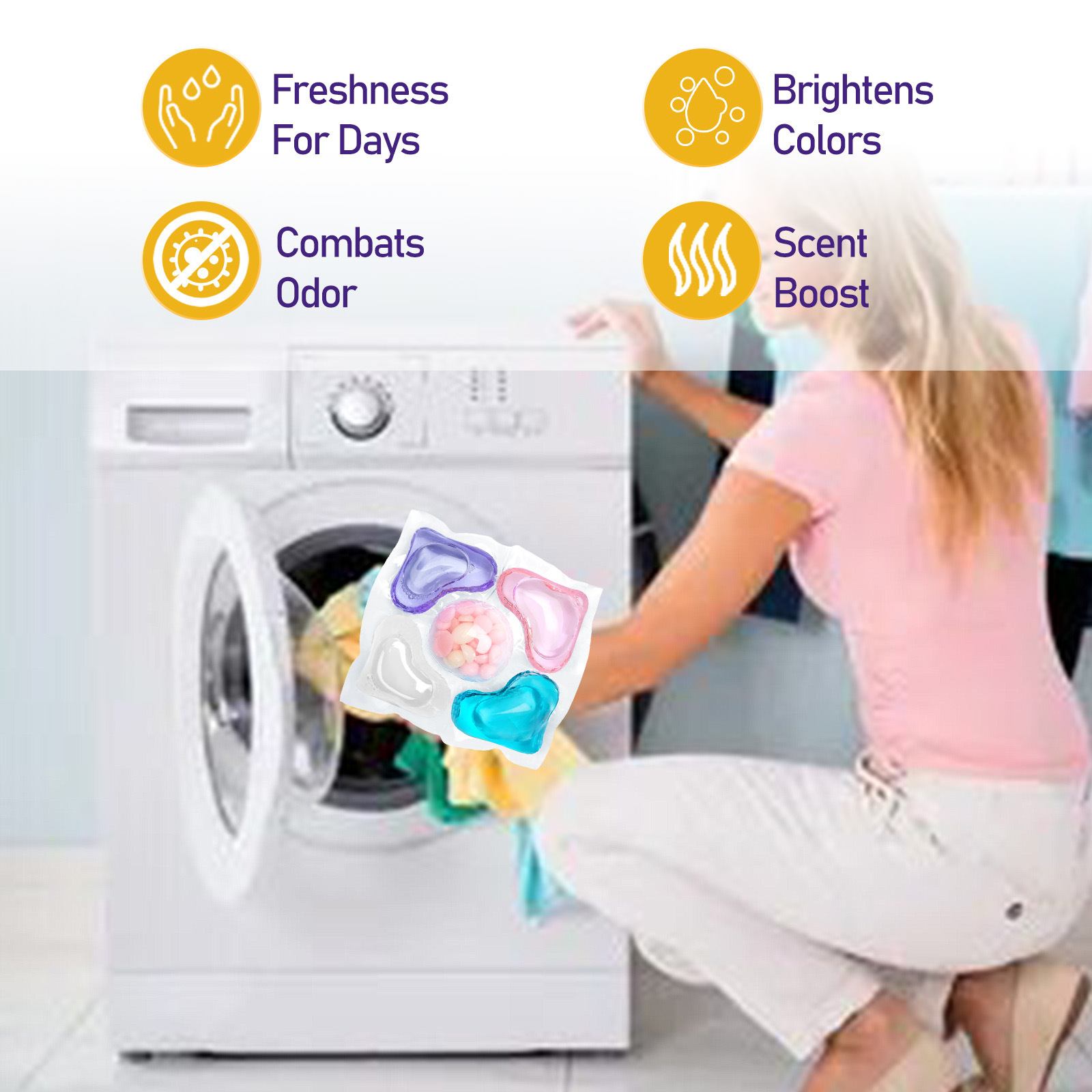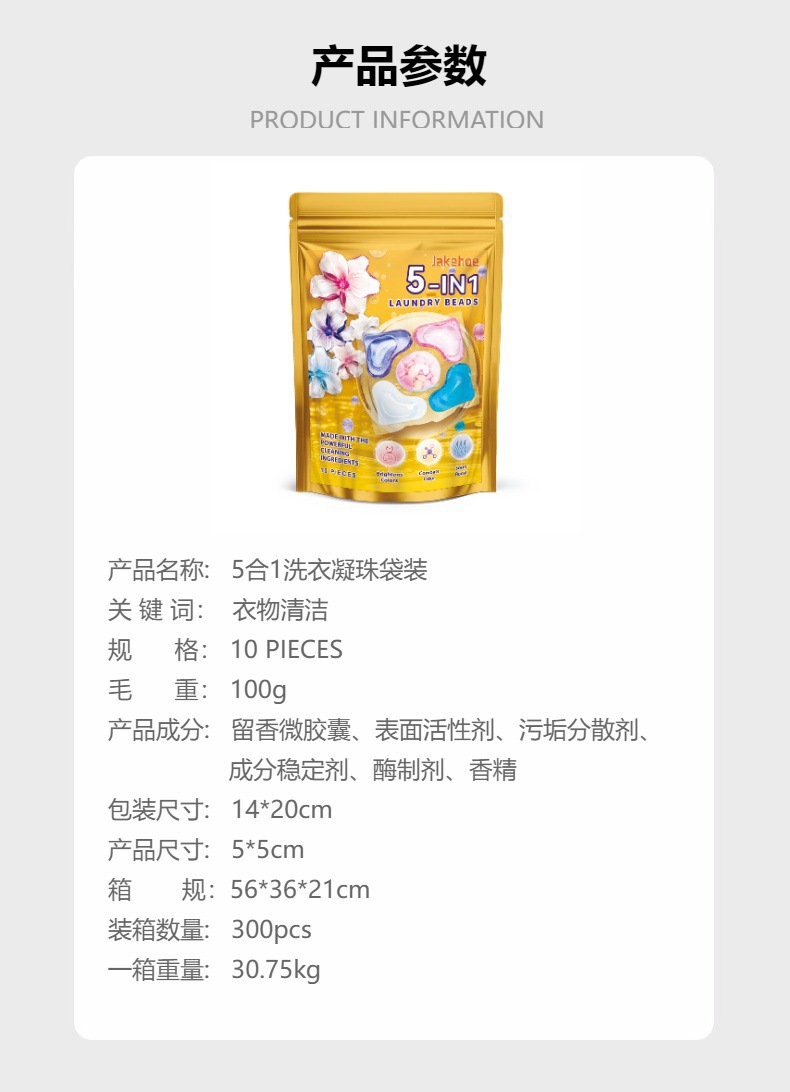 Jakehoe 5合1洗衣凝珠袋装 衣物污渍清洁持久清香柔顺护衣凝珠专供出口 English | 投诉