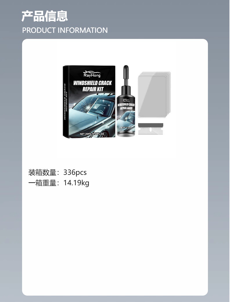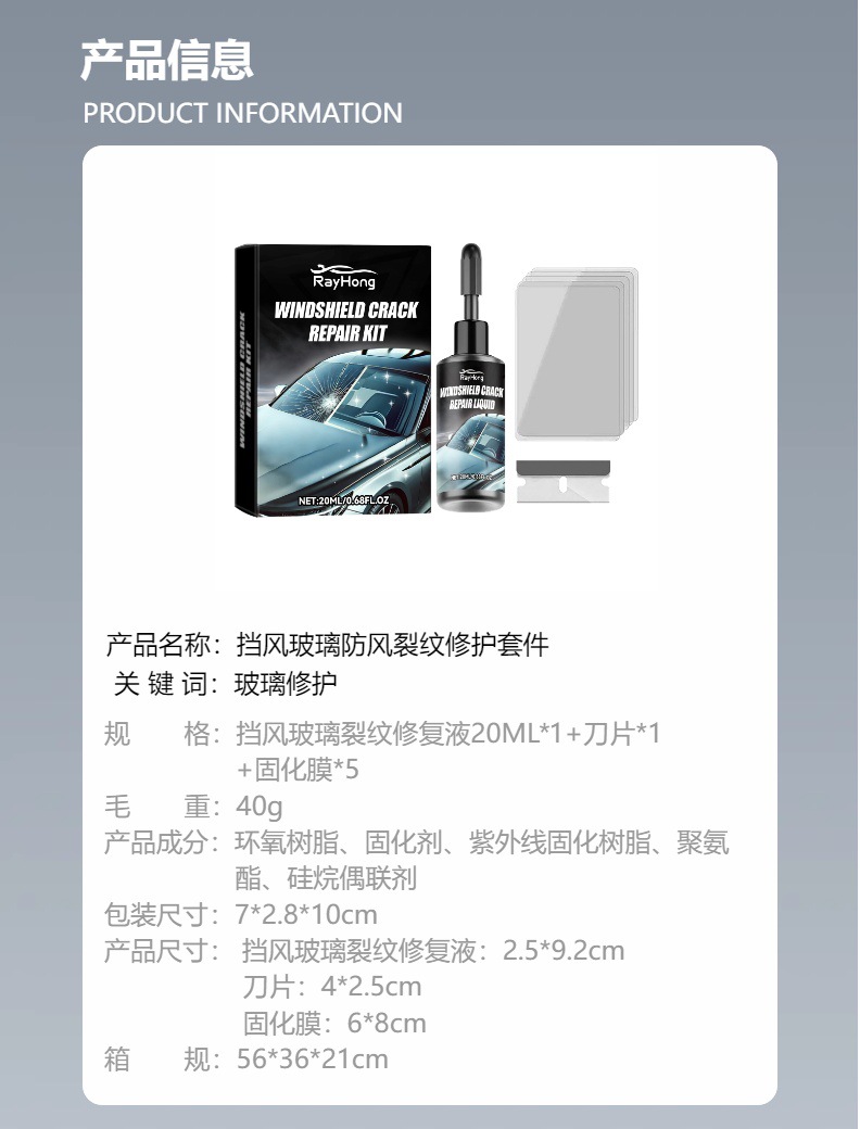 品牌: Rayhong 货号: RA-E04-0029-01 规格: 挡风玻璃裂纹护理液20ML*1+刀片*1 主要下游平台: 亚马逊 主要销售地区: 东北亚 是否跨境出口专供货源: 是 装箱数: 336pcs 箱规: 56*36*21CM 产品分类: 汽车用品-汽车镀膜 重量: 0.1 kg/套