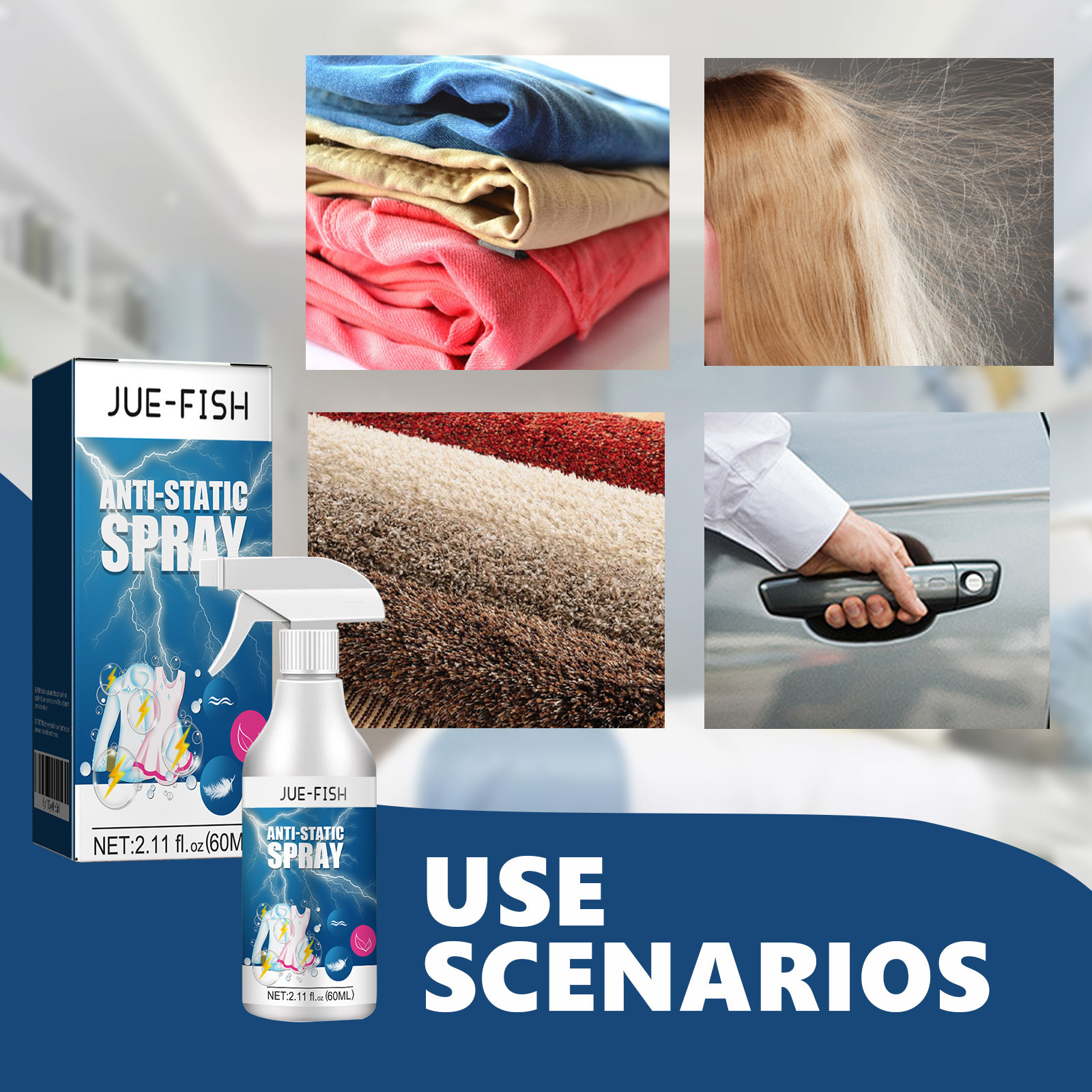 JUE-FISH 防静电喷雾家用衣服羽绒服棉被除静电持久头发喷雾剂专供出口 English | 投诉