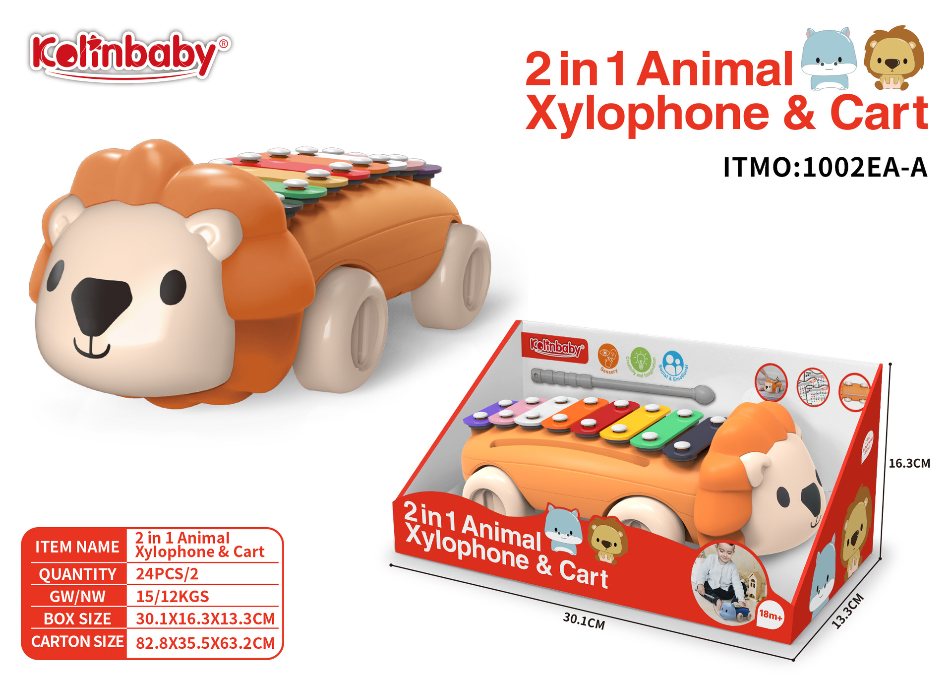 | 1002E-A | 二合一多功能动物敲琴车狮子动物琴 | 展示盒 | 2 | 30.1*16.3*13.3 | 82.8 | 35.5 | 63.2 | 24pcs/2 | 15 | 12 | PP+金属 |