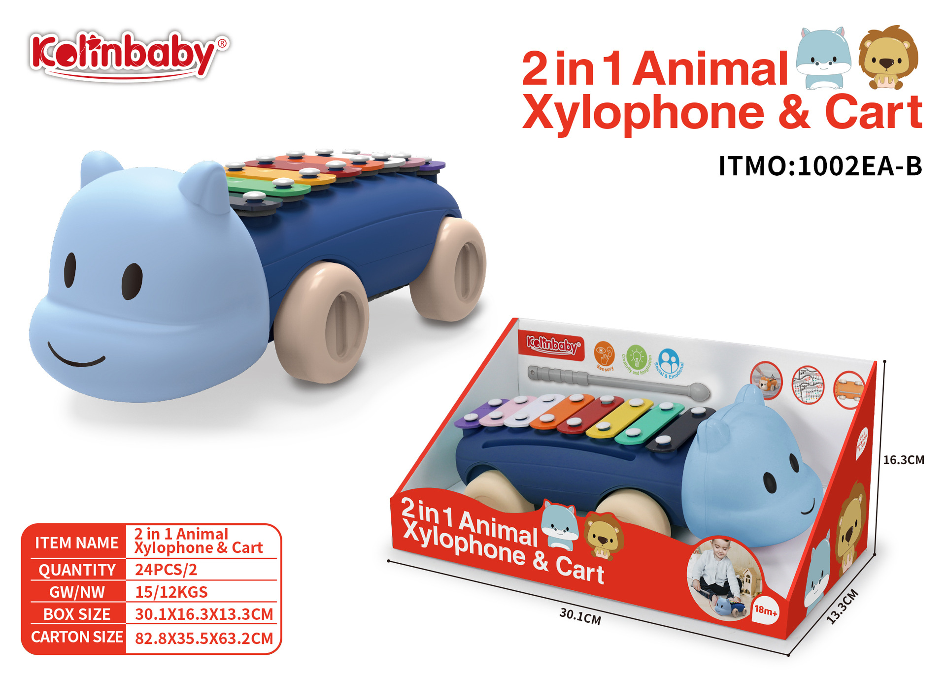 | 1002E-B | 二合一多功能动物敲琴车河马动物琴 | 展示盒 | 2 | 30.1*16.3*13.3 | 82.8 | 35.5 | 63.2 | 24pcs/2 | 15 | 12 | PP+金属 |