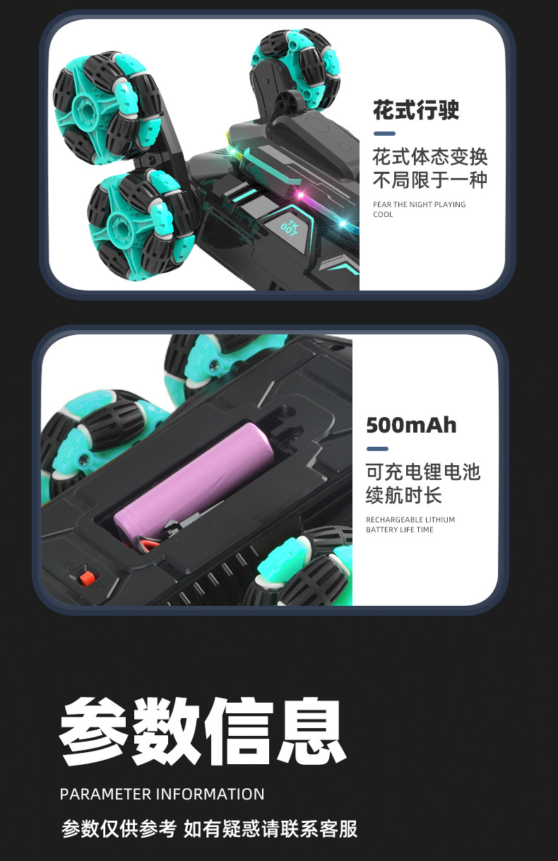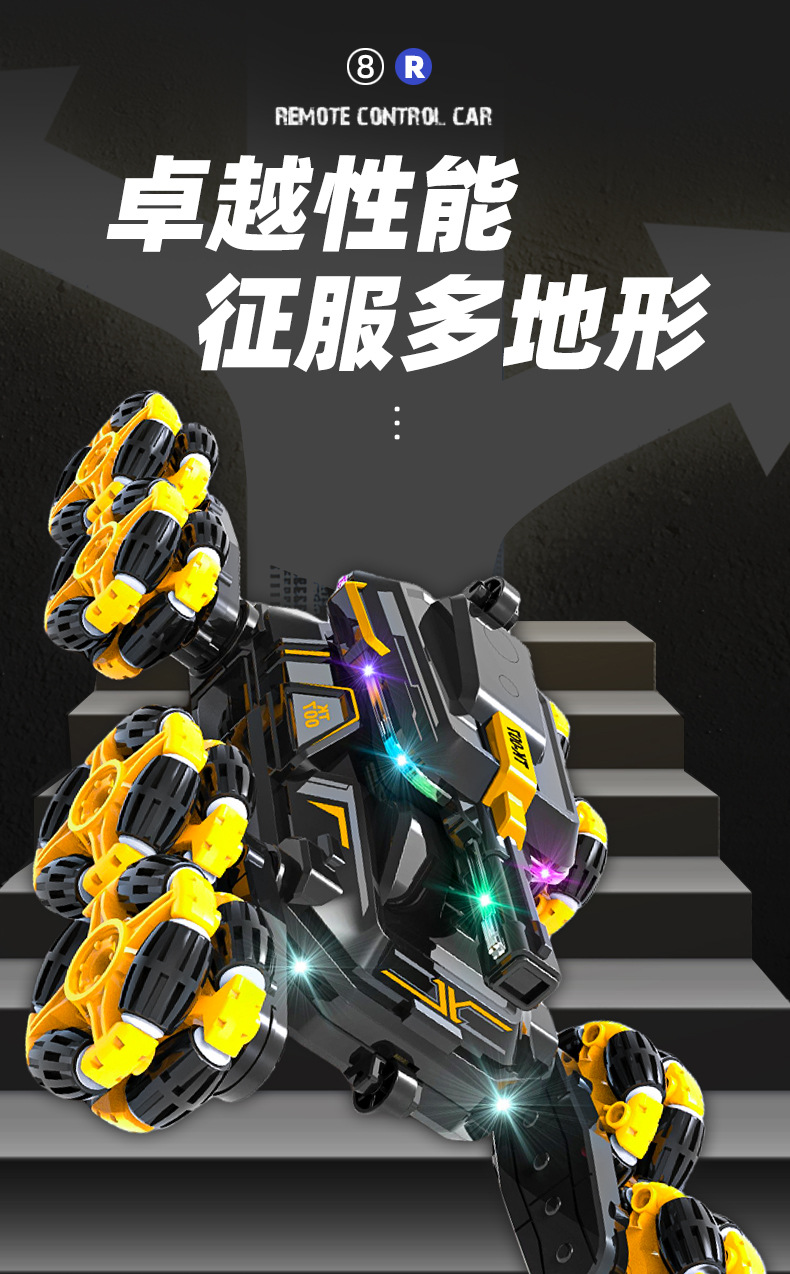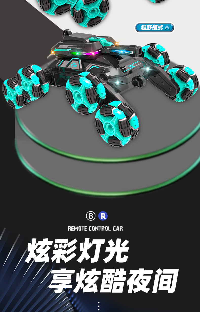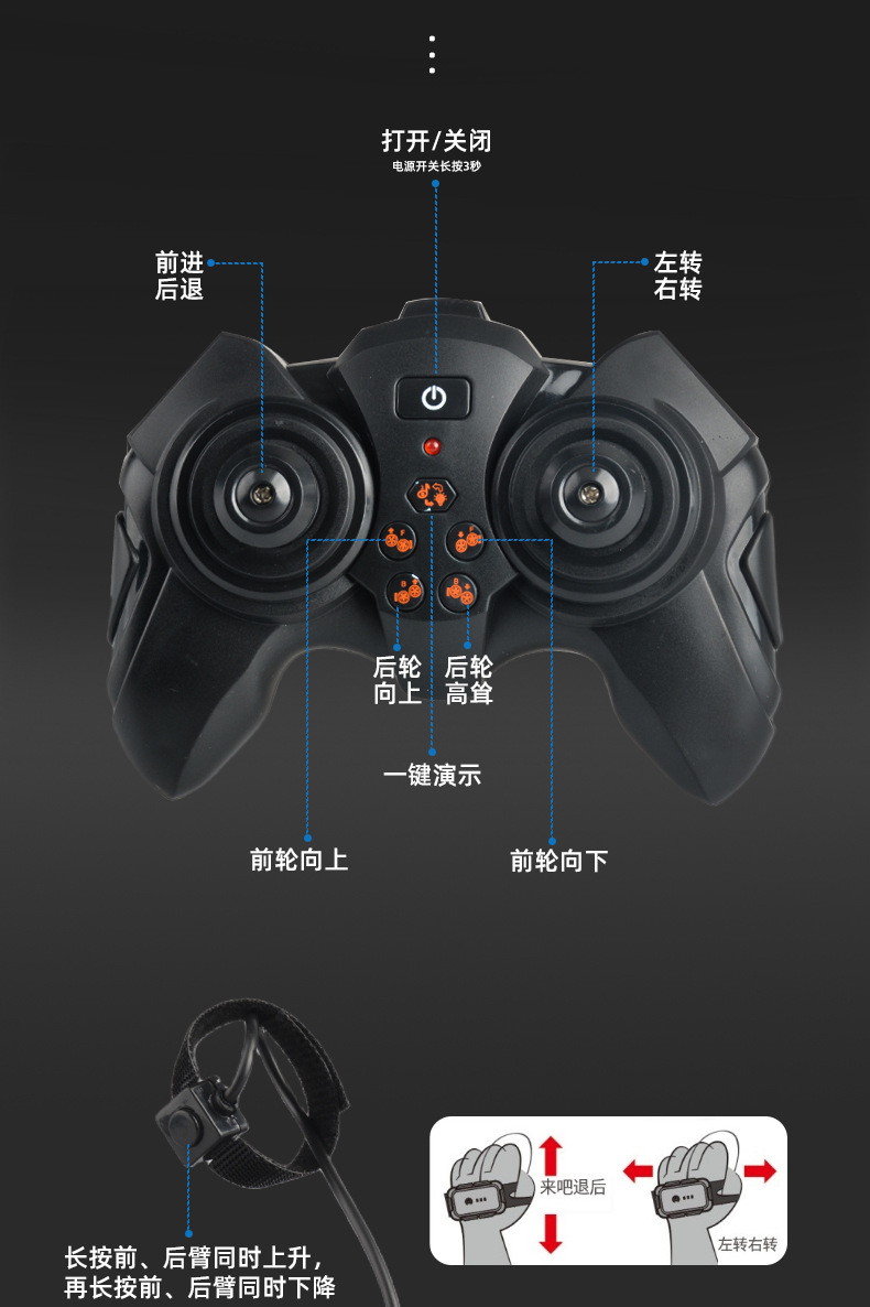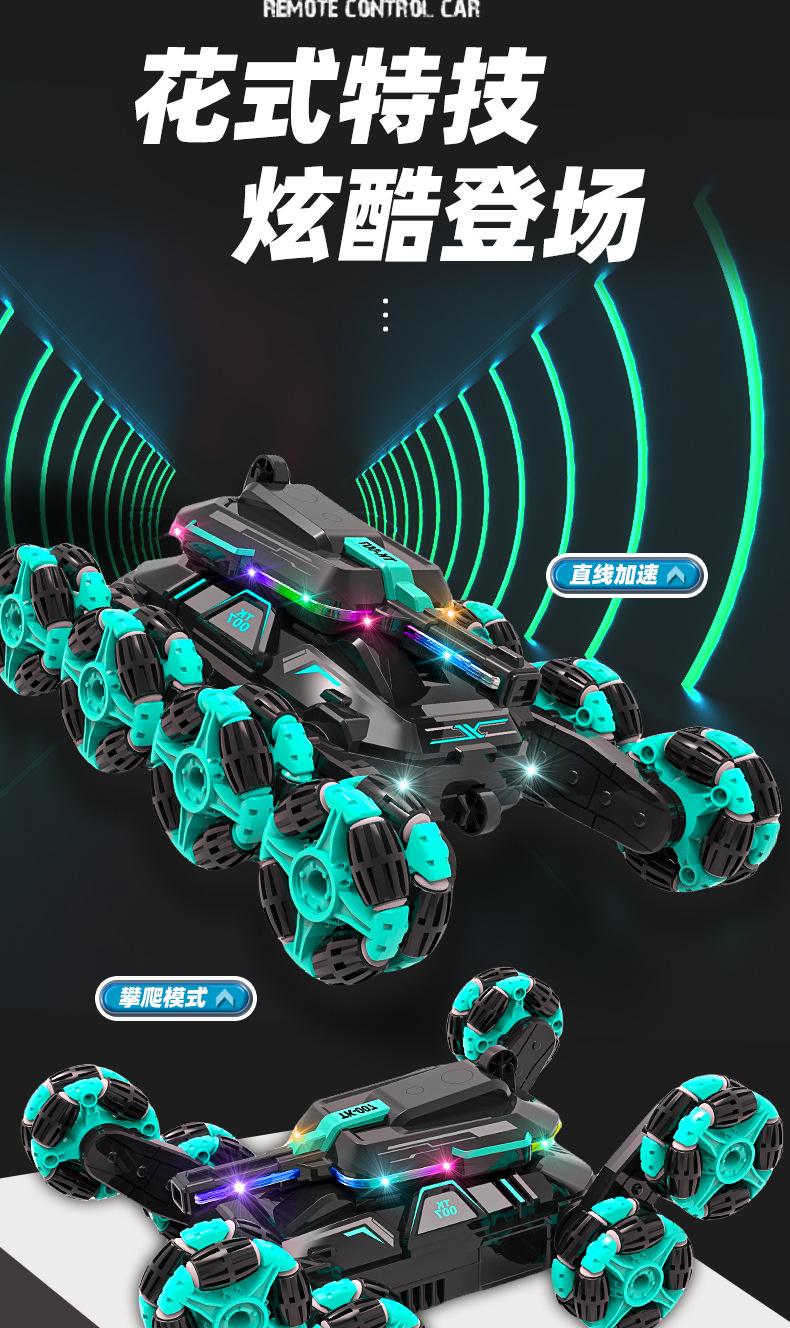 功能:2.4GHZ LED灯,从轮肥楼梯特技功能,后翻身行走功能,漂移散榄轮子行走功能。前进,后退,左转国,右转国。带音乐模式切换键。带灯光模式切换键