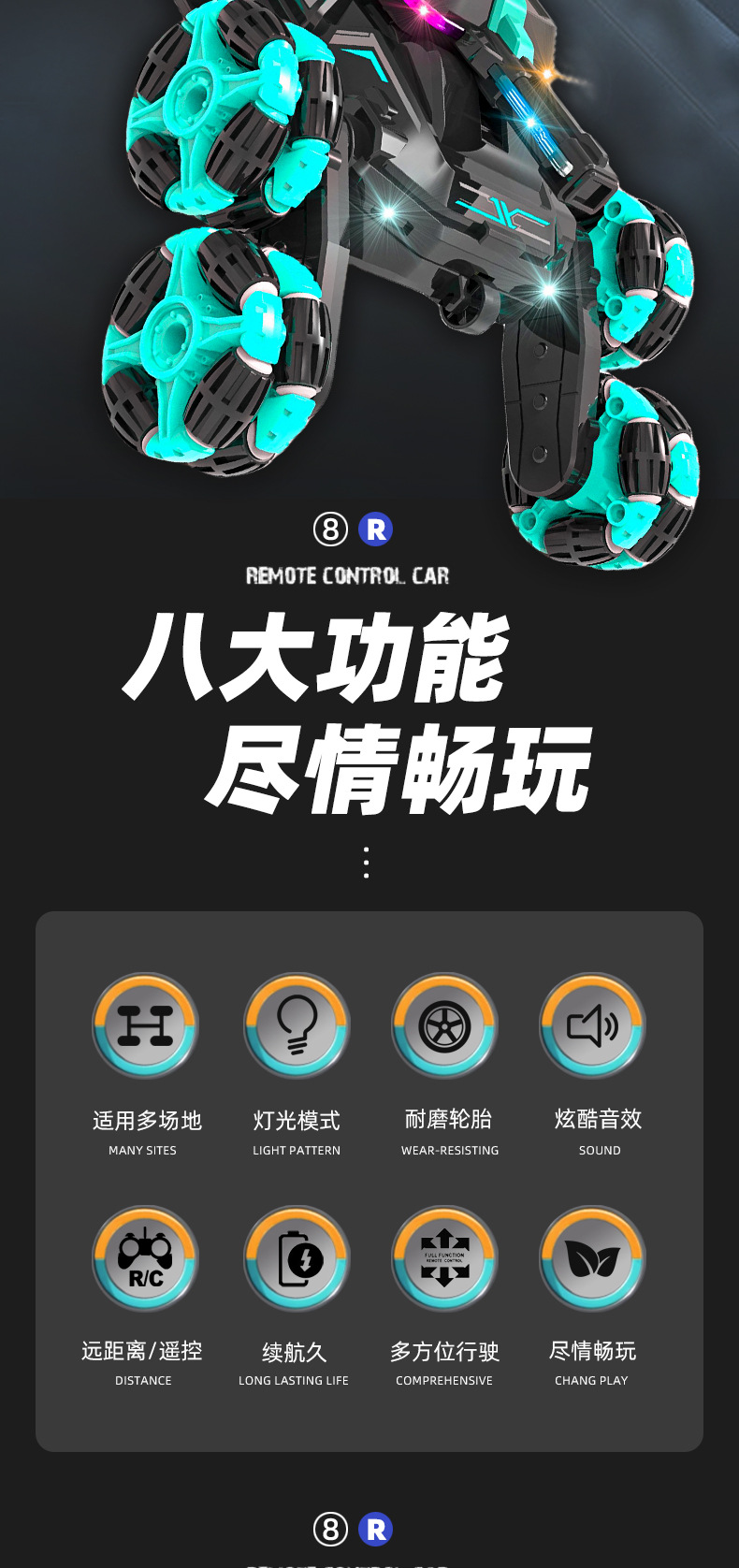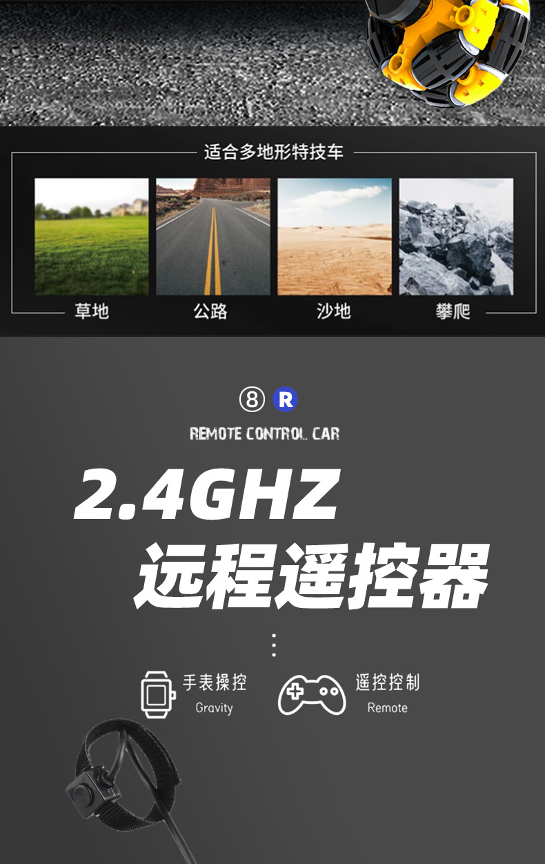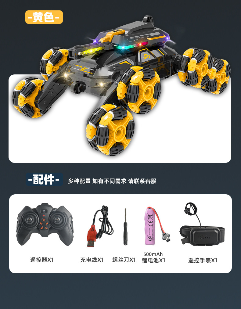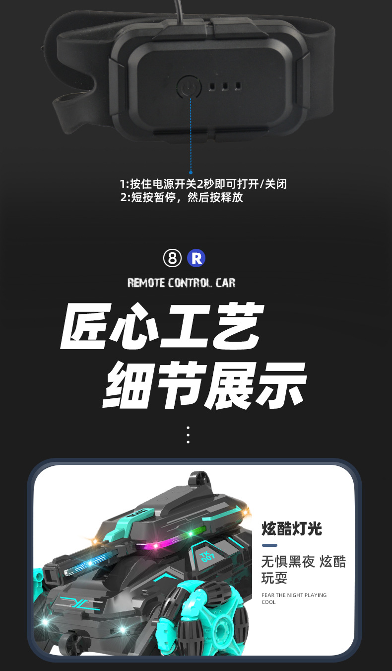 功能:2.4GHZ LED灯,从轮肥楼梯特技功能,后翻身行走功能,漂移散榄轮子行走功能。前进,后退,左转国,右转国。带音乐模式切换键。带灯光模式切换键