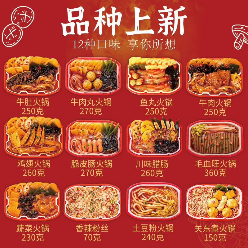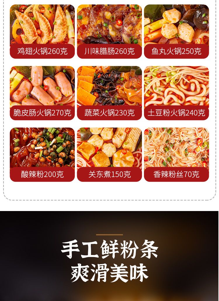 | 鸡翅+鱼丸+蔬菜+血旺+土豆+纯宽粉 | ¥3337 | 99999件可售 |
