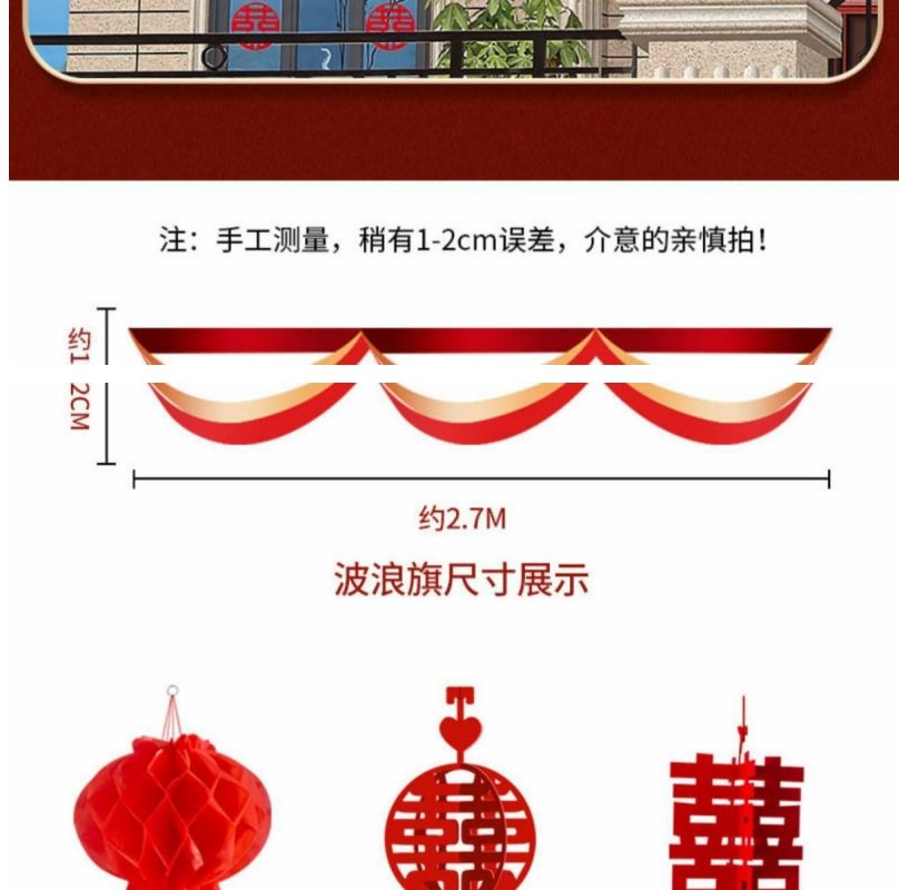 | 波浪旗+大红拉花+喜字吊坠 | ¥2527 | 99999件可售 |