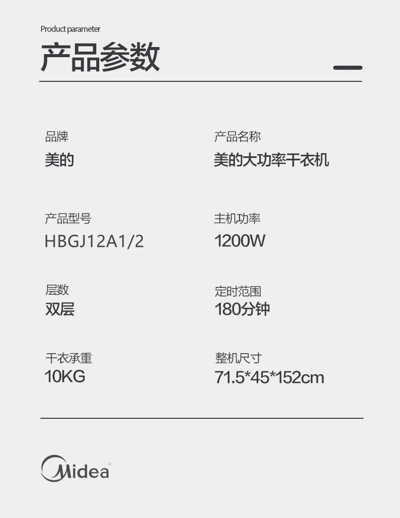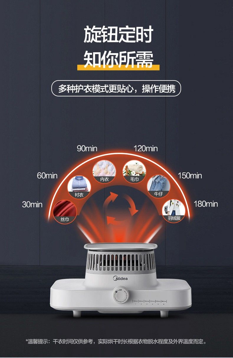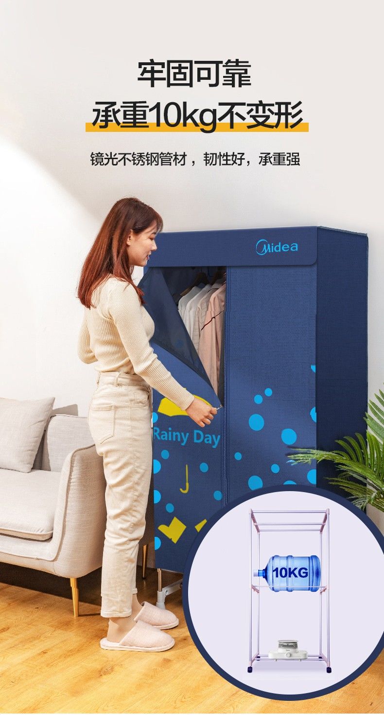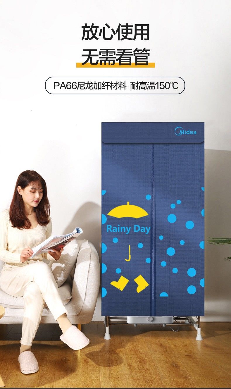 品牌: Midea/美的 产品类型: 布罩衣柜式 干衣容量: 15kg 产品功率: 1500W 功能: 干衣 ;断电保护 重量: 0.5 kg/件 装箱信息:长宽高:30X30X50cm 装箱重量: 11KG 装箱数量:50pcs