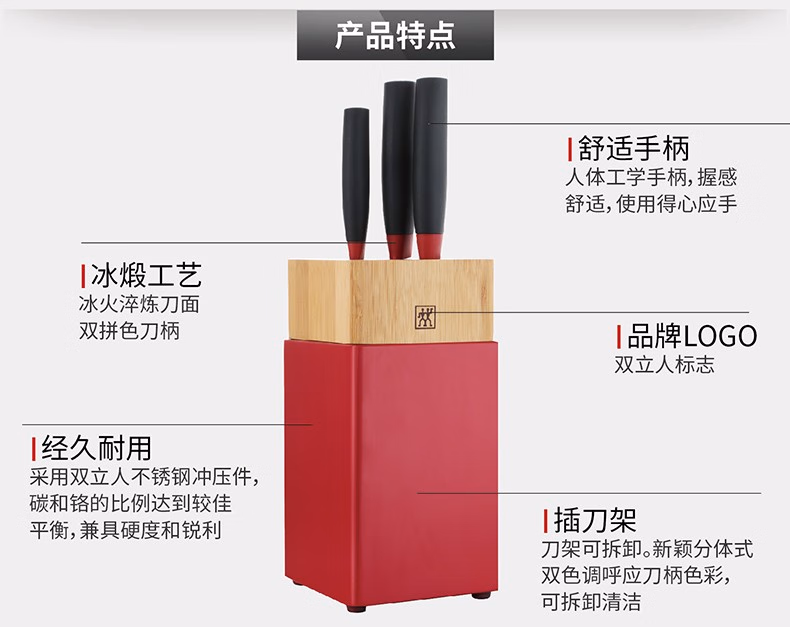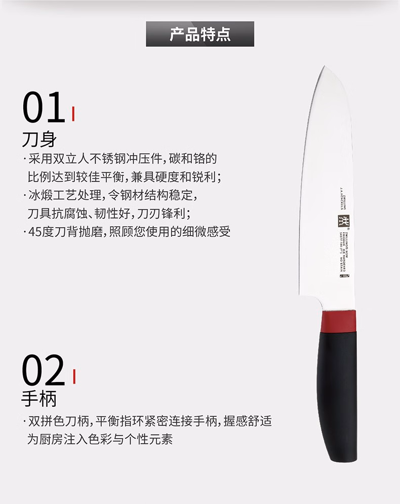 1. 冰煅工艺 冰火淬炼刀面:45°刀背磨抛,舒适,切配锋利,刀面不锈钢本色