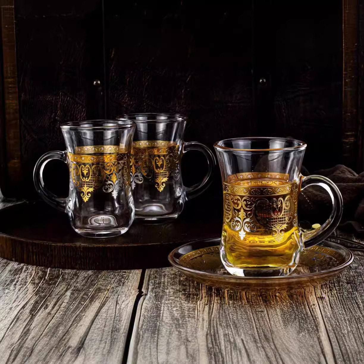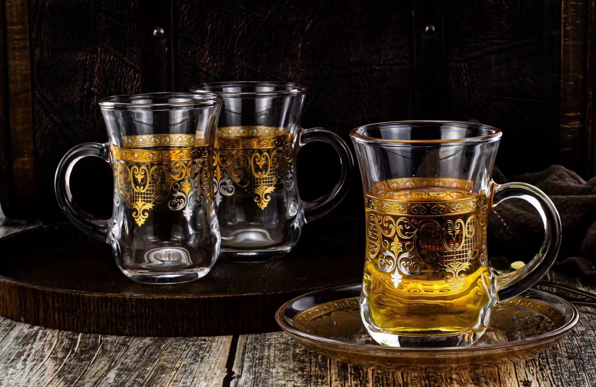 创意透明玻璃水杯跨境货源玻璃杯烫金浮雕花玻璃咖啡杯拿铁杯