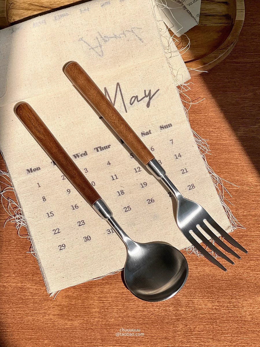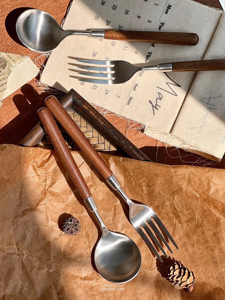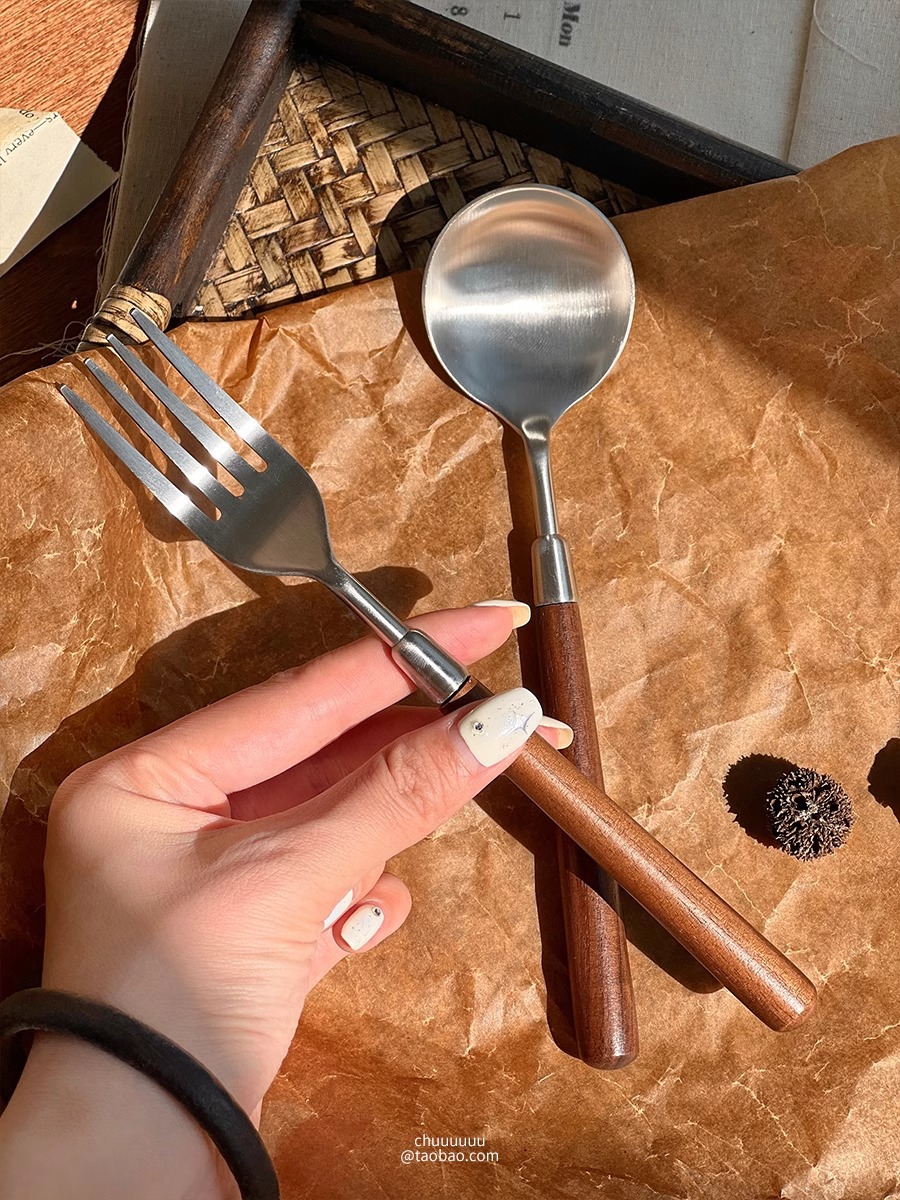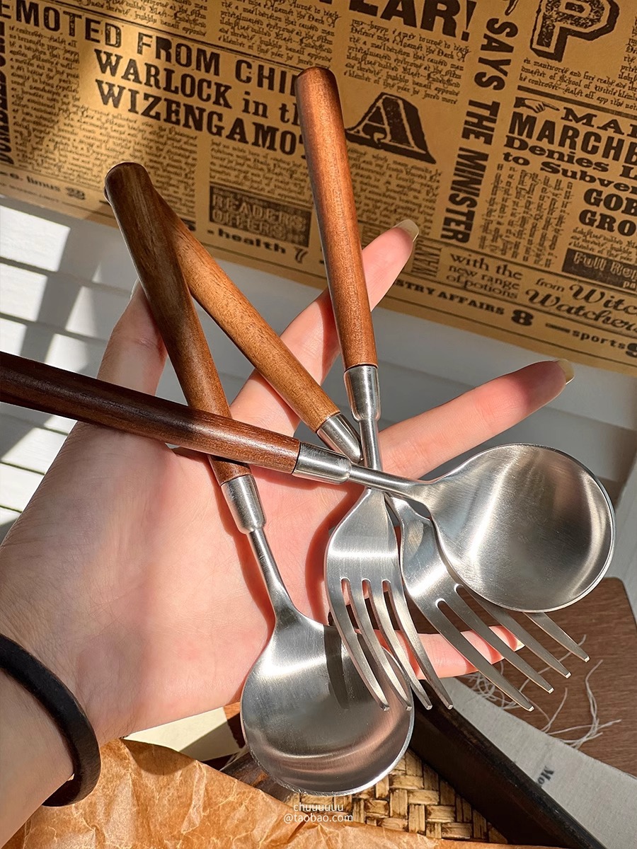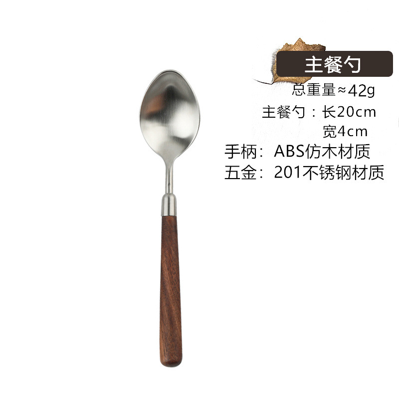 仿胡桃木柄简约质感不锈钢勺子叉子套装家用西餐餐勺高颜值餐具