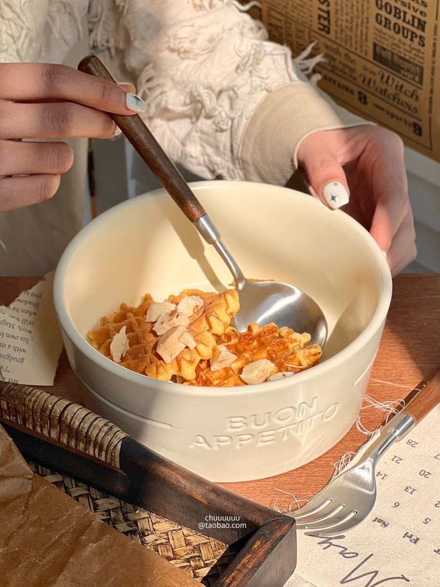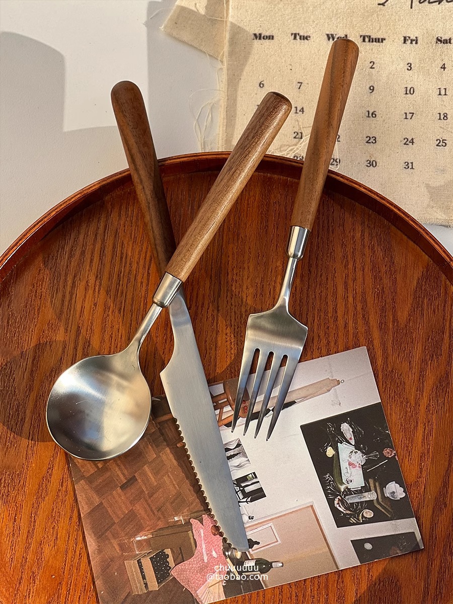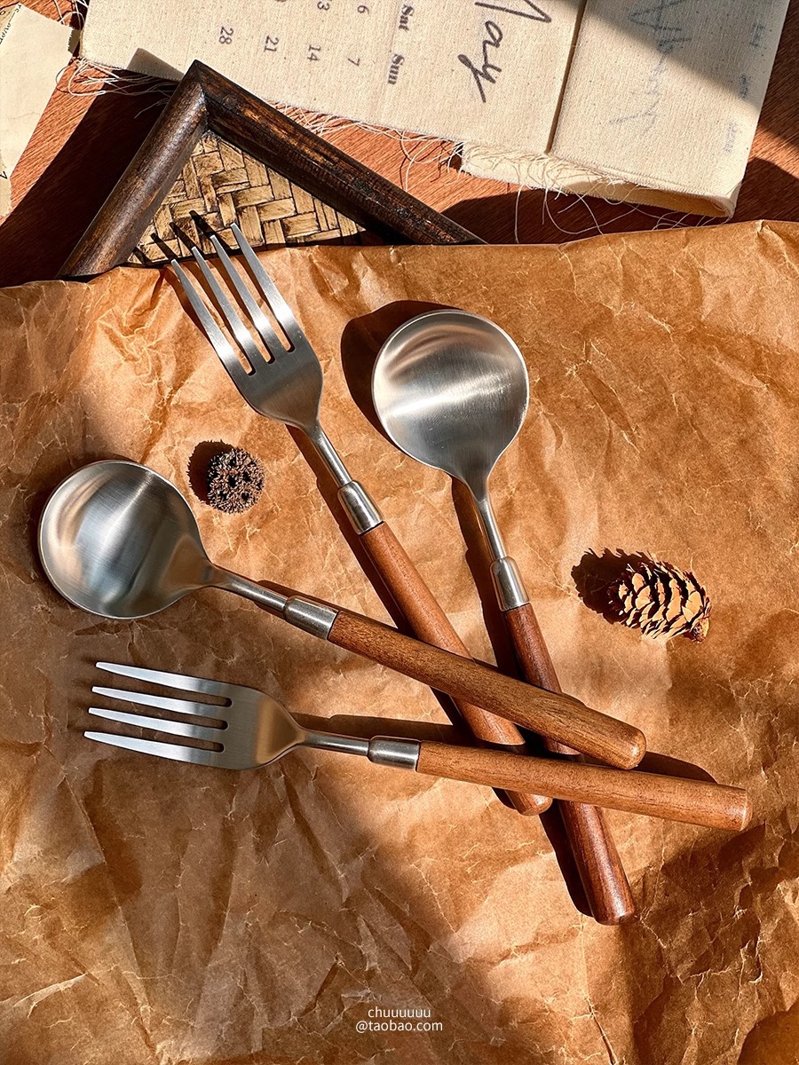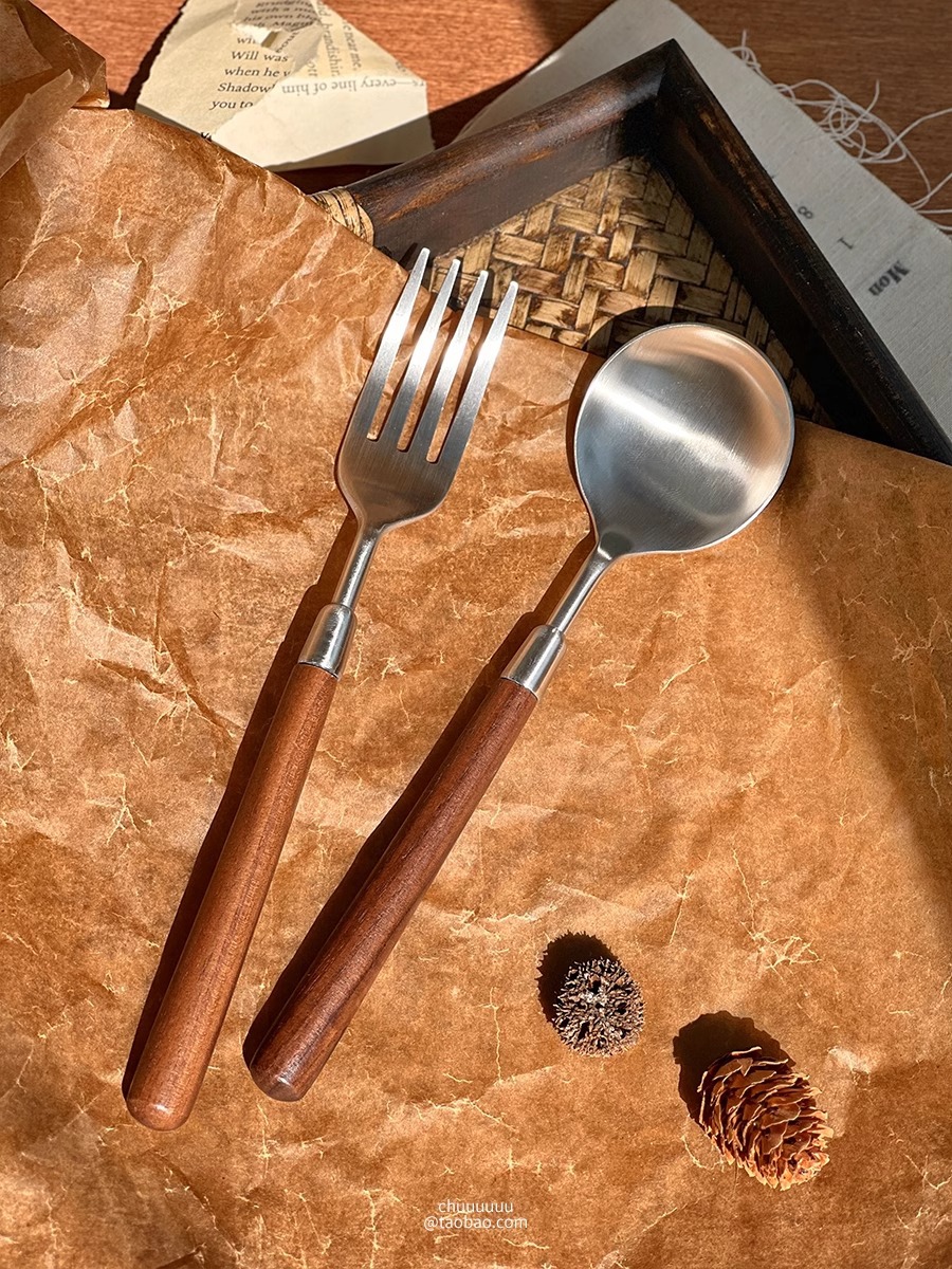 仿胡桃木柄简约质感不锈钢勺子叉子套装家用西餐餐勺高颜值餐具