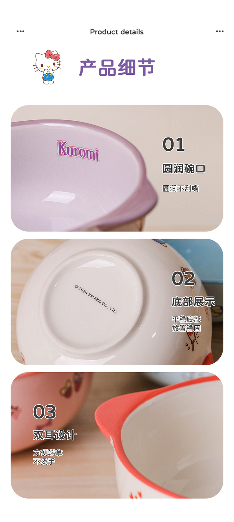 是否进口: 否 产品类别: 碗 材质: 陶瓷 风格: 可爱风 是否有专利: 无 是否属于礼品: 是,个人礼品 风格类型: 清新萌趣 颜色: 酷洛米双耳碗 重量: 0.5 kg/件 装箱信息:长宽高:10X10X10cm 装箱重量: 1KG 装箱数量:5pcs