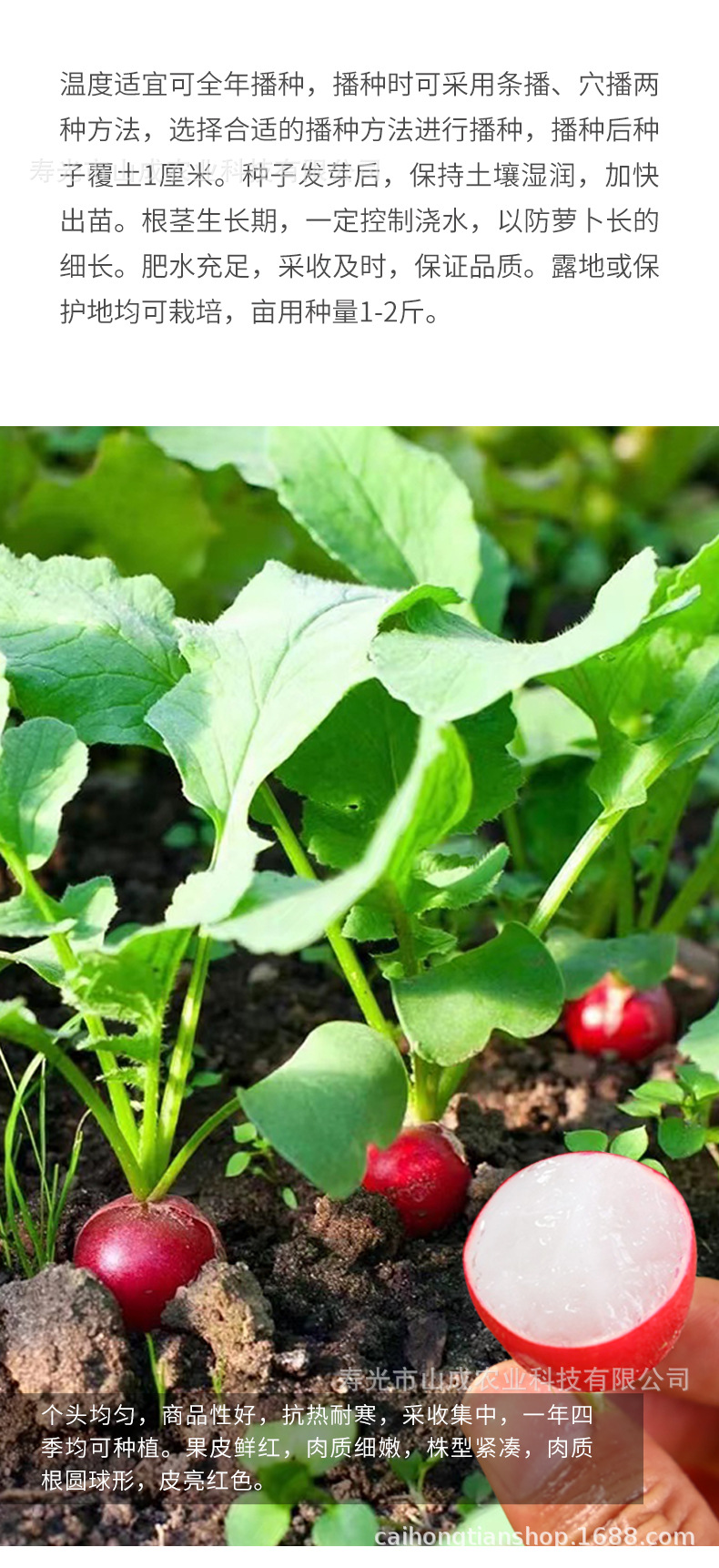 品种: 萝卜 级别: 一级良种 品种纯度: 94 净度: 98 发芽率≥: 85 含水量≤: 8.0 成活率: 98 产地/厂家: 山东寿光 货号: 樱桃萝卜种子 品牌: 彩虹田 重量: 0.5 kg/袋 装箱信息:长宽高:10X10X10cm 装箱重量: 1KG 装箱数量:5pcs