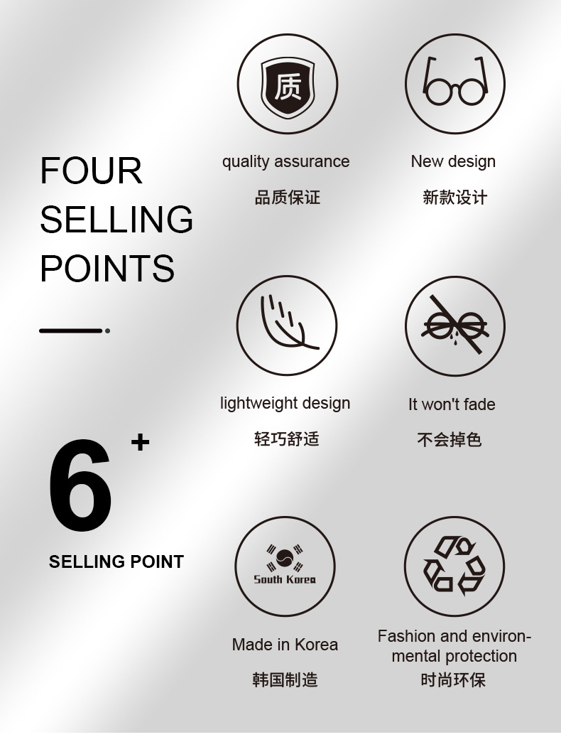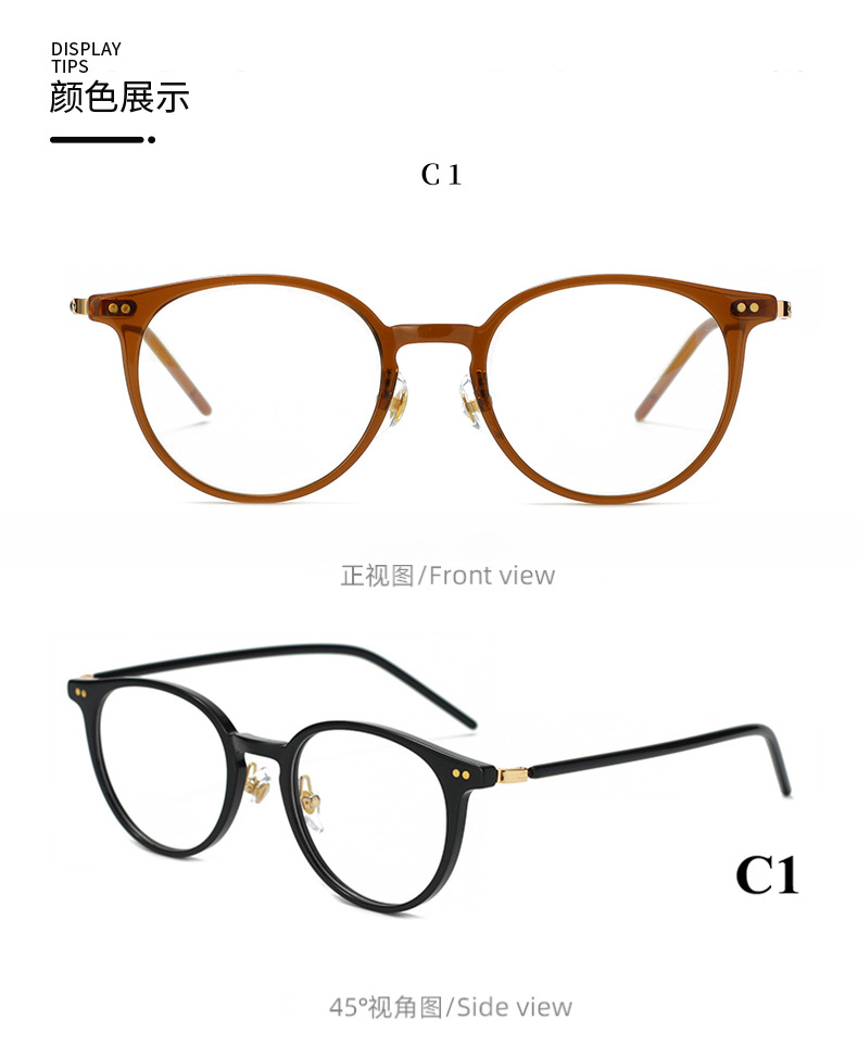 上市年份/季节: 2023年夏季 是否跨境出口专供货源: 是 货号: KBT98820 镜框颜色: C1,C2,C3,C4,C5,C6 适用人群: 通用 产地: 丹阳 规格: 48-20-146 眼镜结构: 全框架 度数: 平光 镜片材质: 树脂 重量: 0.5 kg/副 装箱信息:长宽高:10X10X10cm 装箱重量: 1KG 装箱数量:5pcs