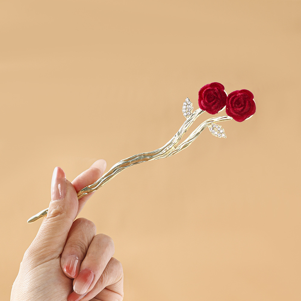 新中式发簪高级后脑勺盘发发钗马面裙丝绒玫瑰高级感盘发发钗头饰