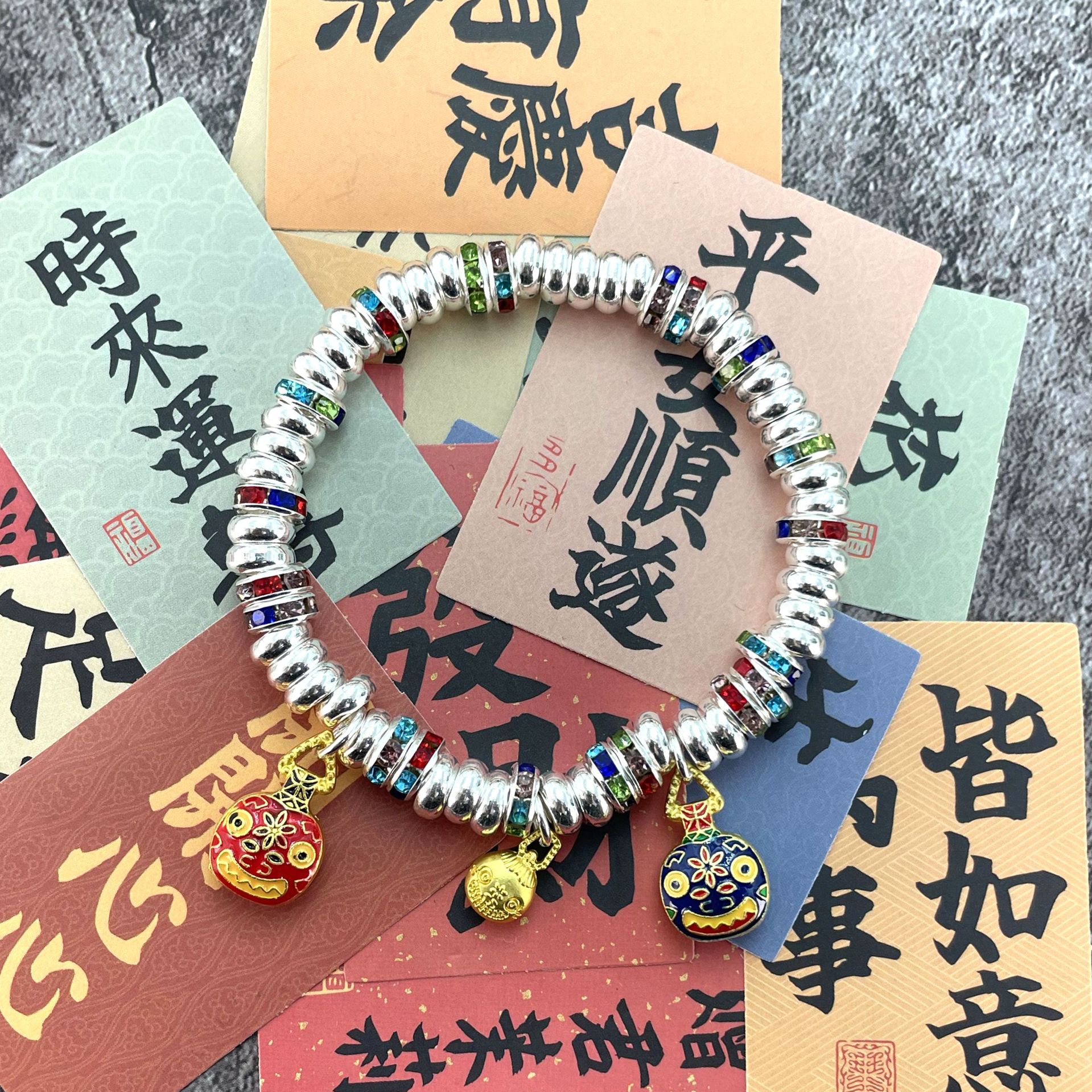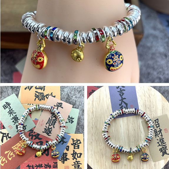彩色吞金兽一家三口描金盘缠银手链创意时尚百搭可爱手串一件代发