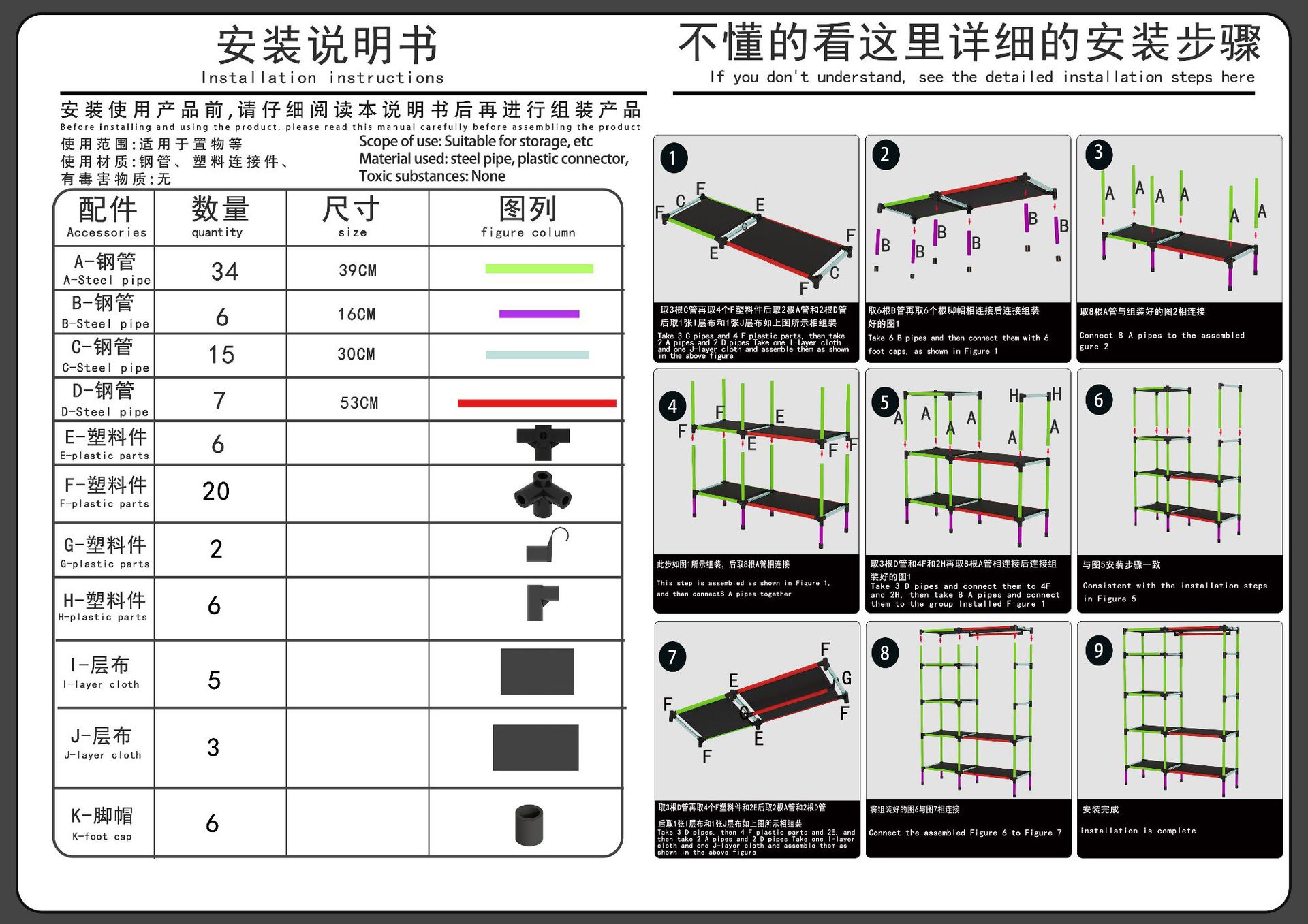商品材质:塑料配件+烤漆管+无纺布