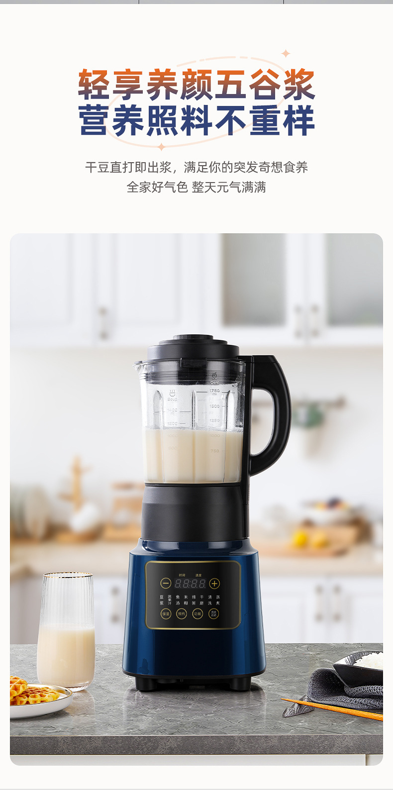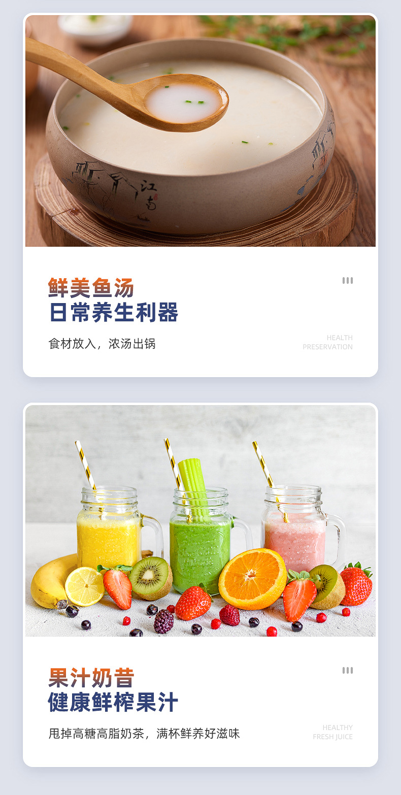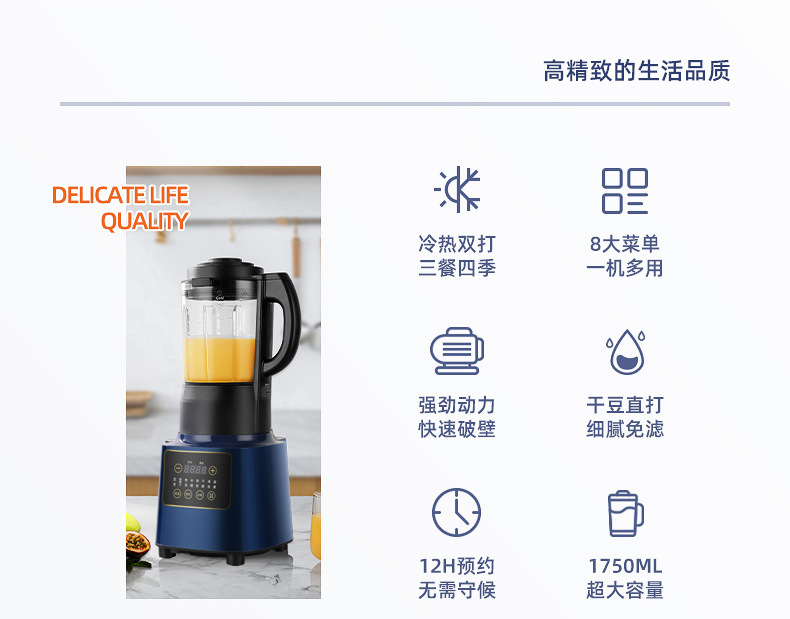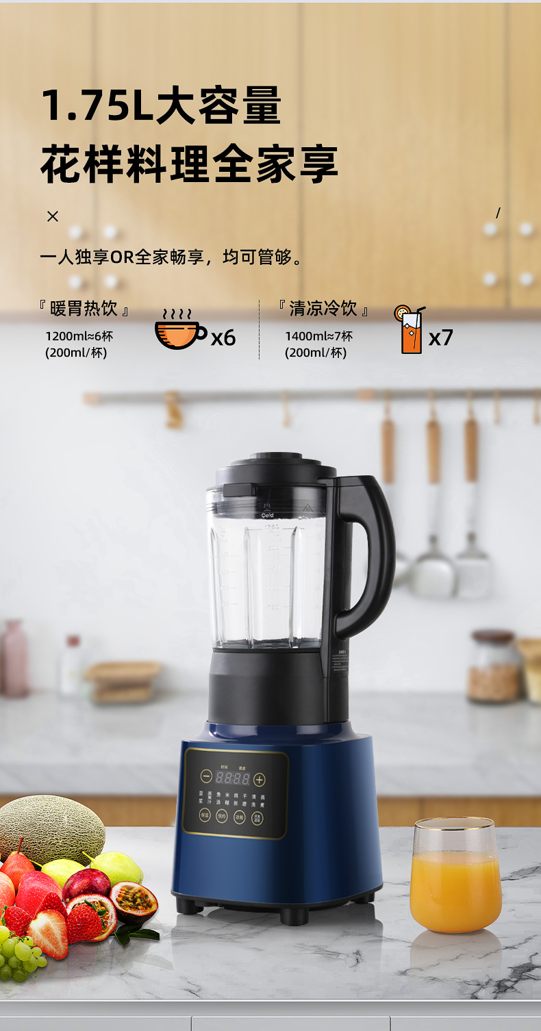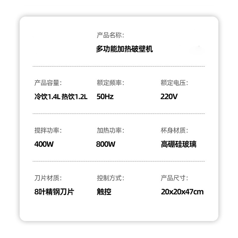 适用人数: 2-4 操控方式: 触控式 容量: 1.2L以上 特色功能: 破壁免滤 产品规格: 196*194*396 是否跨境出口专供货源: 否 主要销售地区: 其他 主要下游平台: 其他 有可授权的自有品牌: 是 重量: 3.2 重量: 1.0 kg/台 装箱信息:长宽高:10X10X10cm 装箱重量: 1KG 装箱数量:5pcs