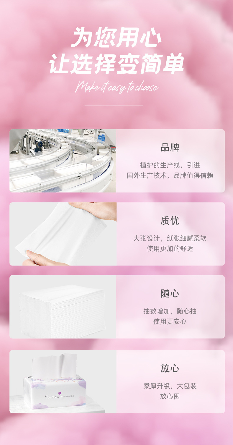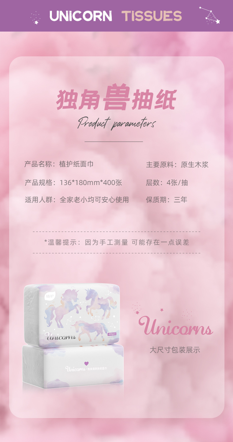 品牌: 植护 商品条形码: 6972205225622 重量: 2251.1g 材质: 原生木浆 纸巾尺寸(cm): 136mm*180mm 型号: 独角兽抽纸16包装 保质期: 3年 产地: 福建 加印LOGO: 不可以 加工定制: 否 重量: 0.5 kg/箱 装箱信息:长宽高:40X30X30cm 装箱重量: 10KG 装箱数量:50pcs