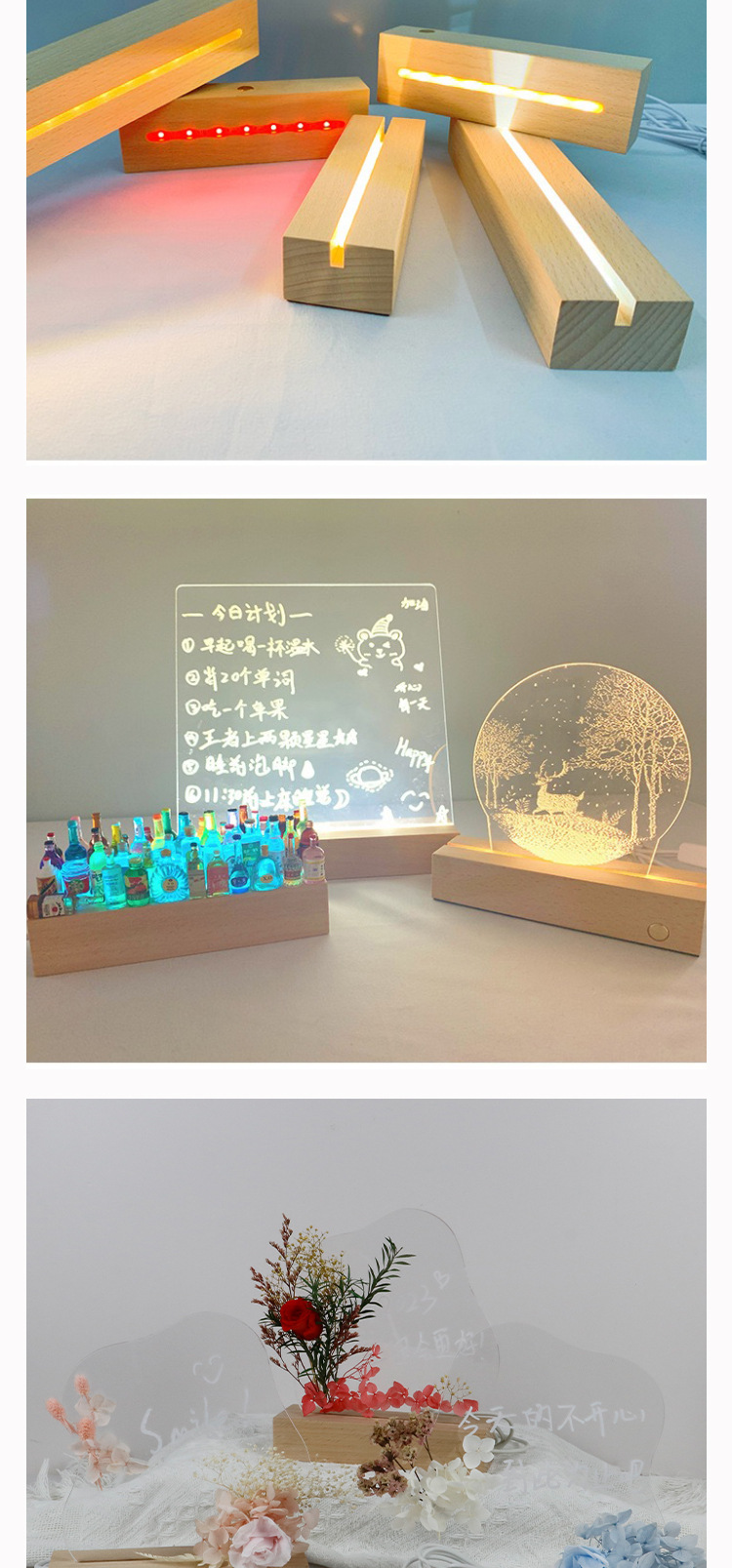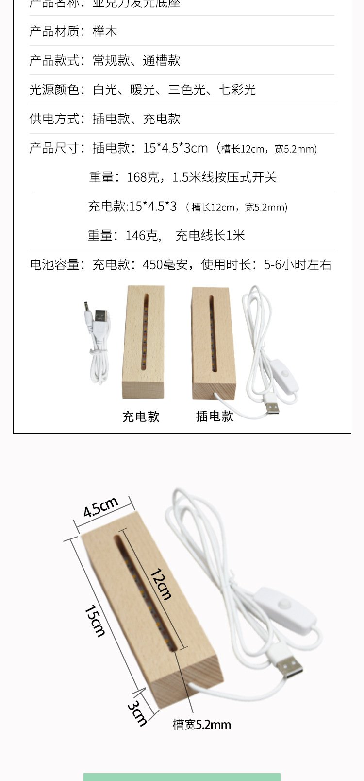 亚克力发光底座实木长条灯座 USB接口5V开关小夜灯榉木工艺品批发 English | 投诉