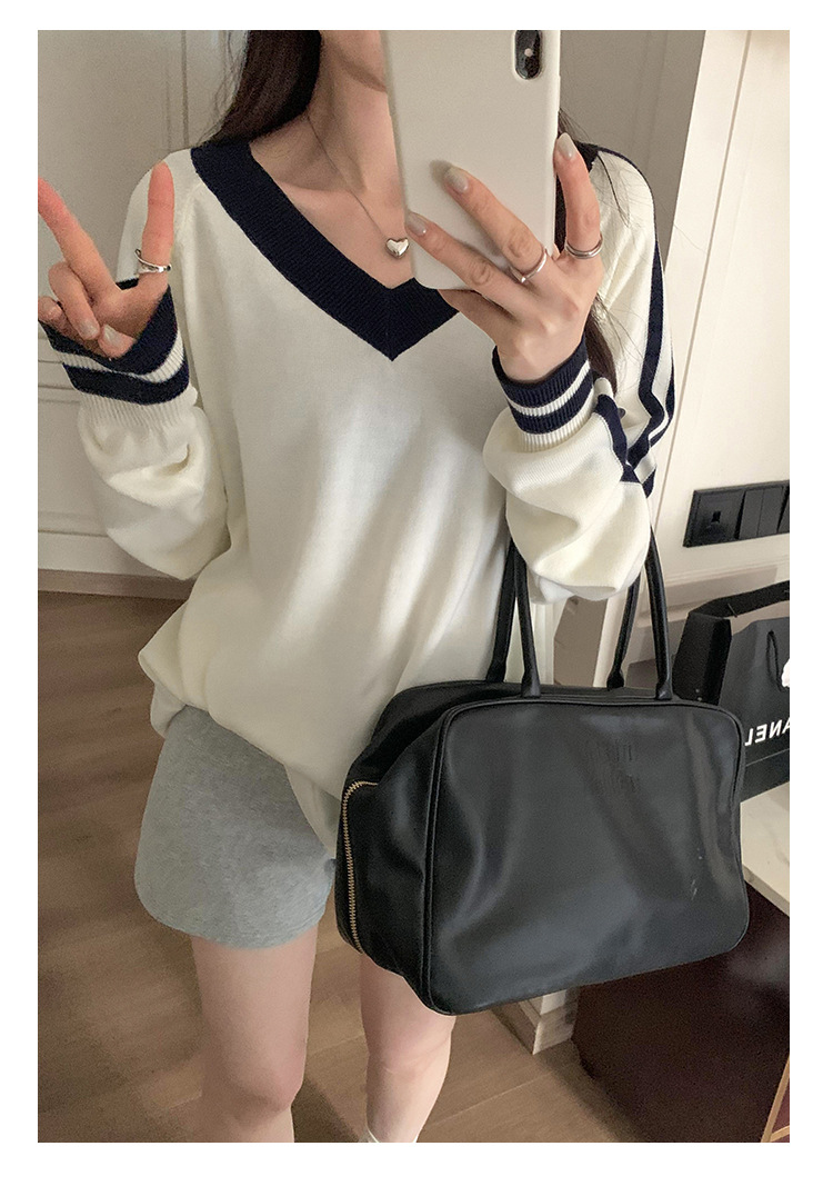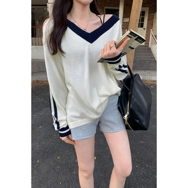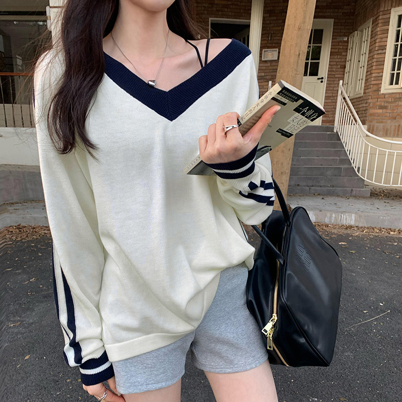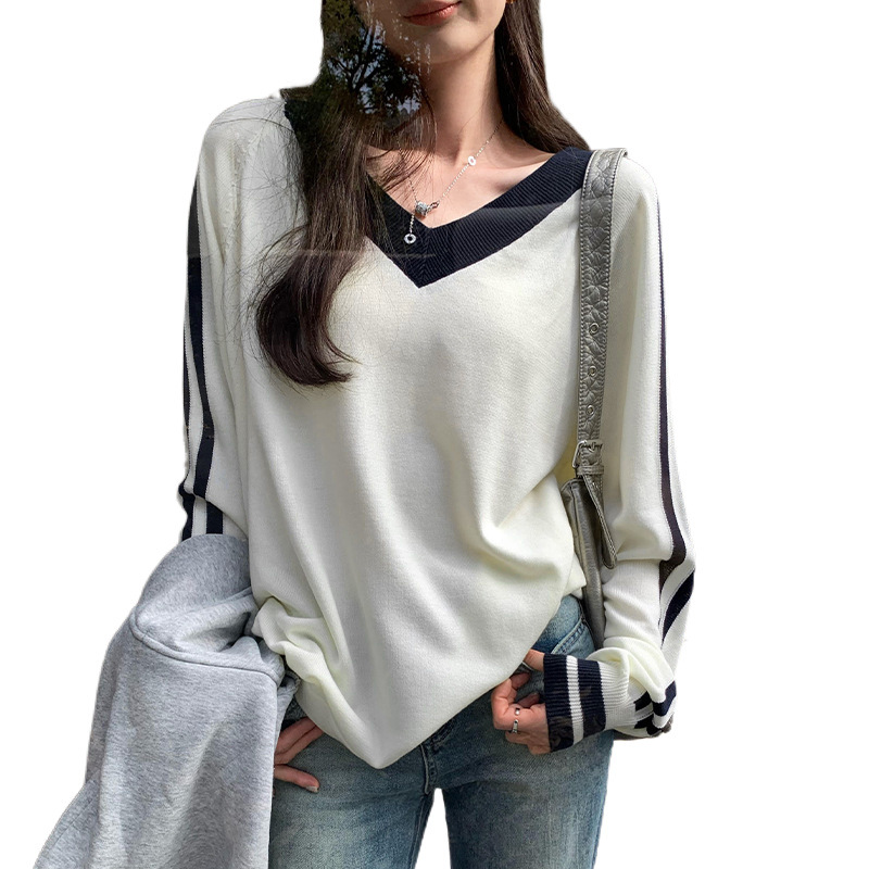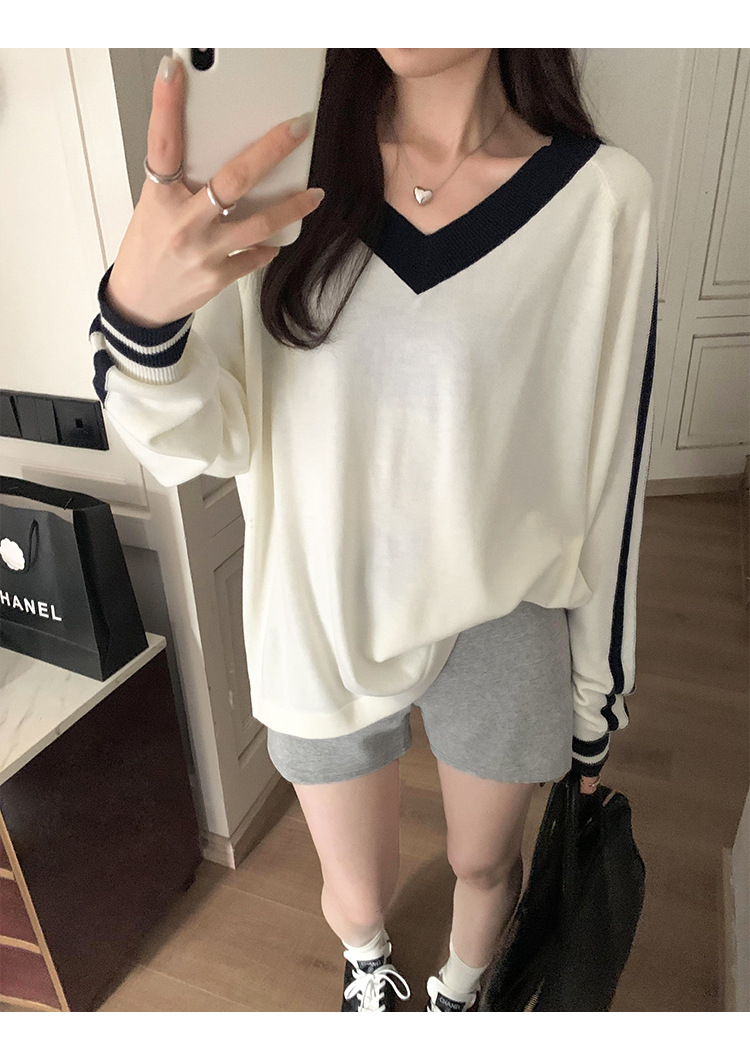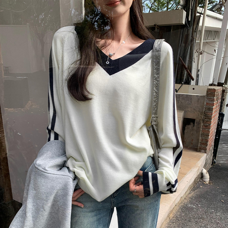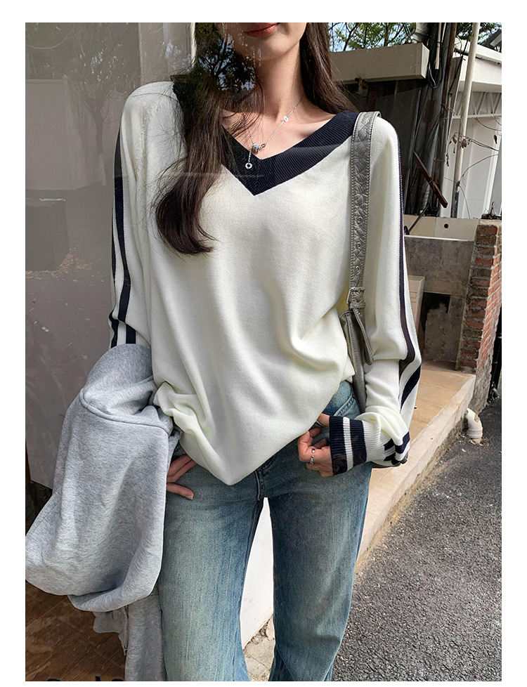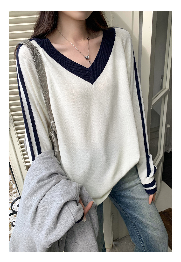 2025实拍图韩系宽松V领撞色条纹羊毛打底衫女秋冬新款设计感气质