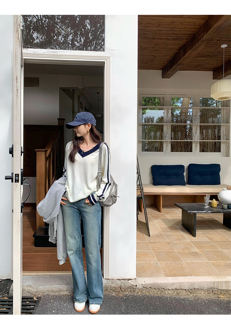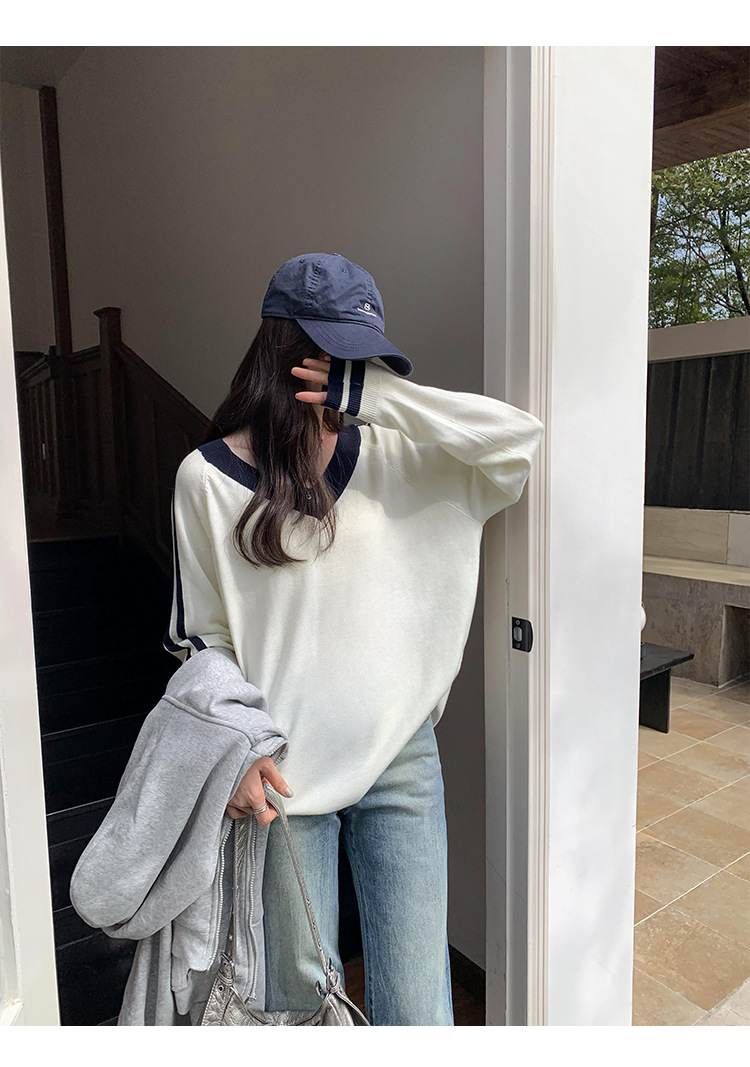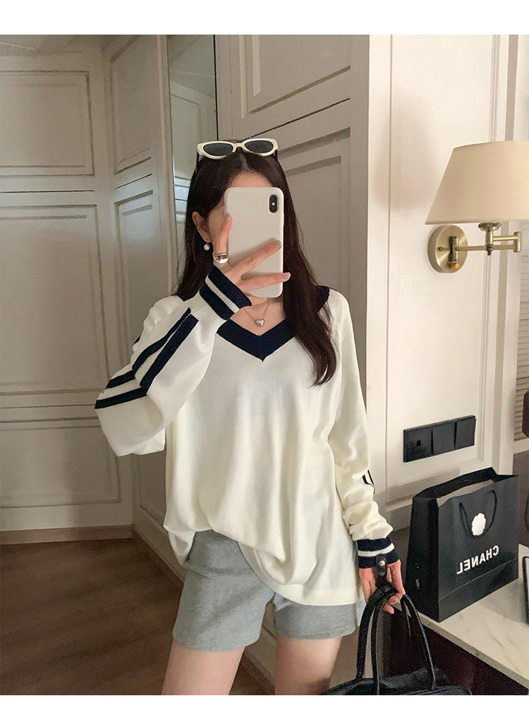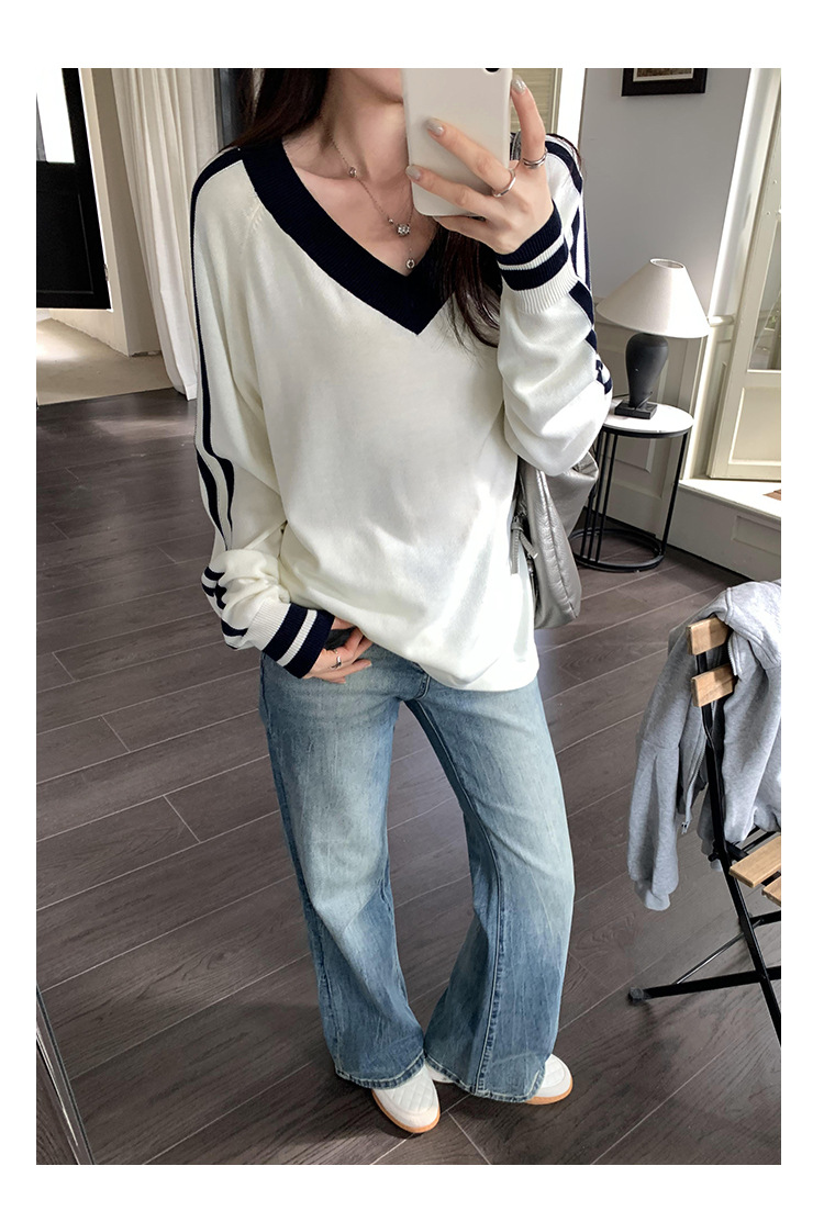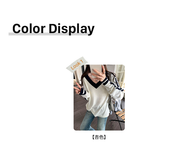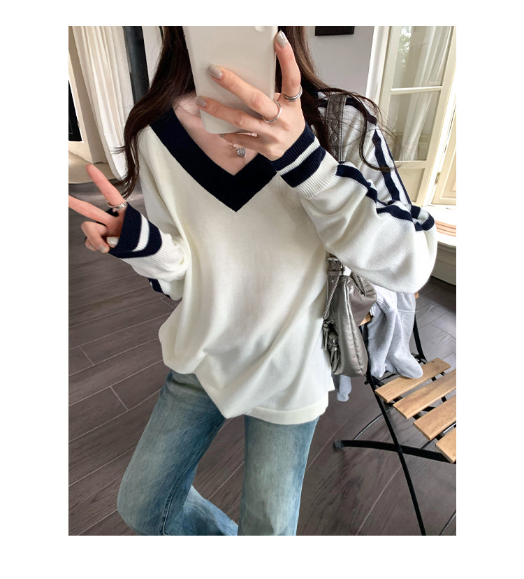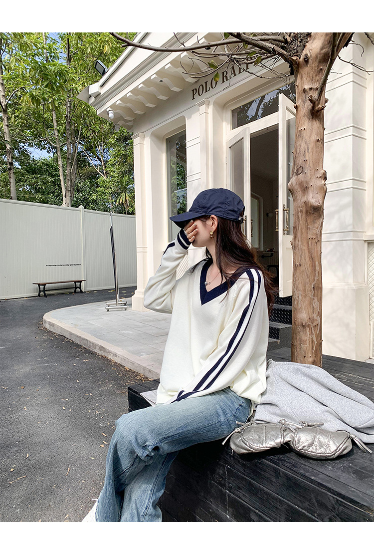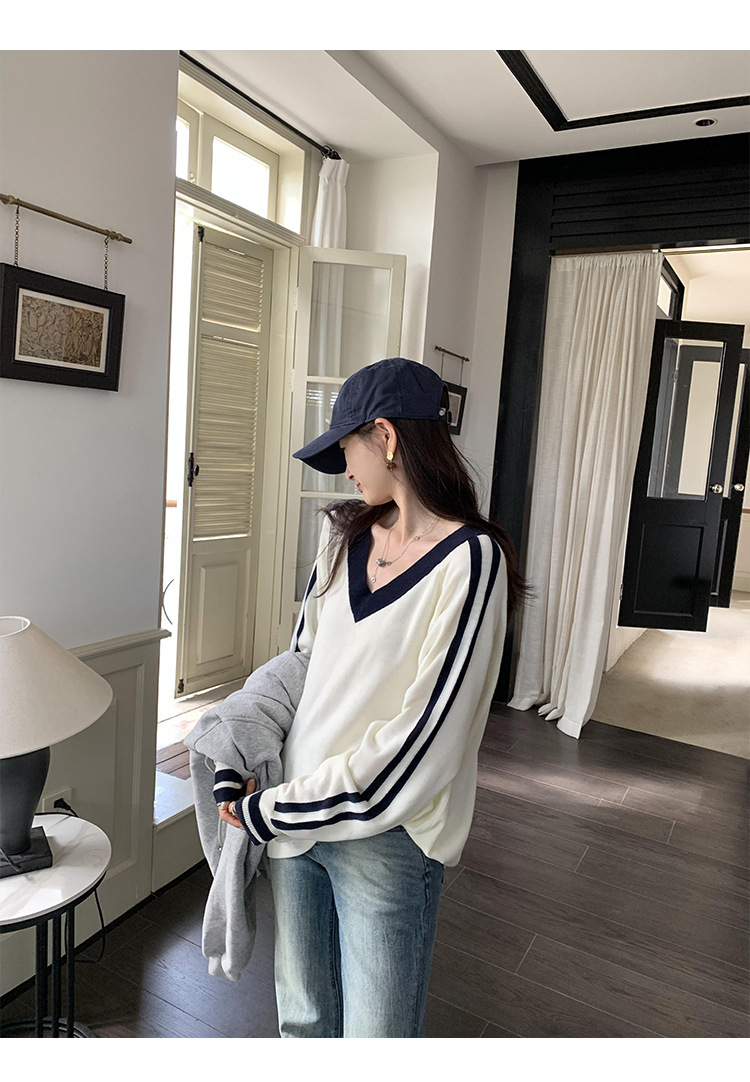 2025实拍图韩系宽松V领撞色条纹羊毛打底衫女秋冬新款设计感气质 English | 投诉