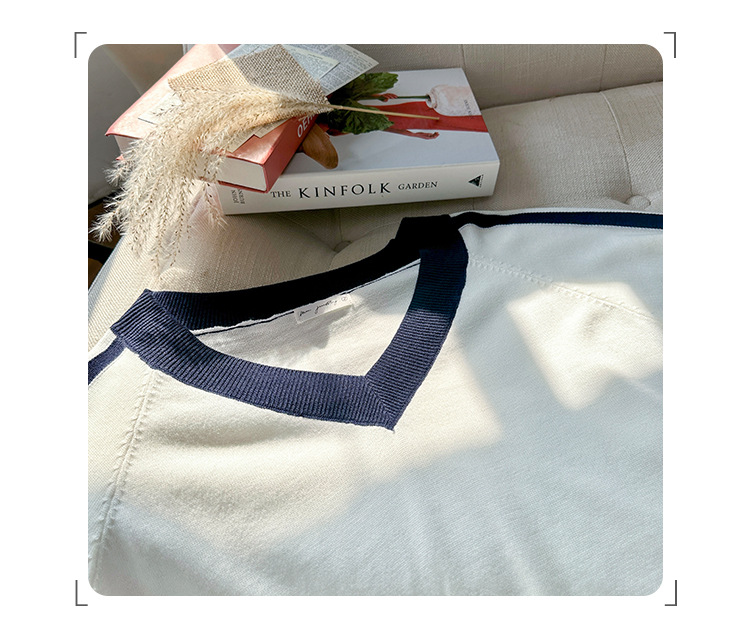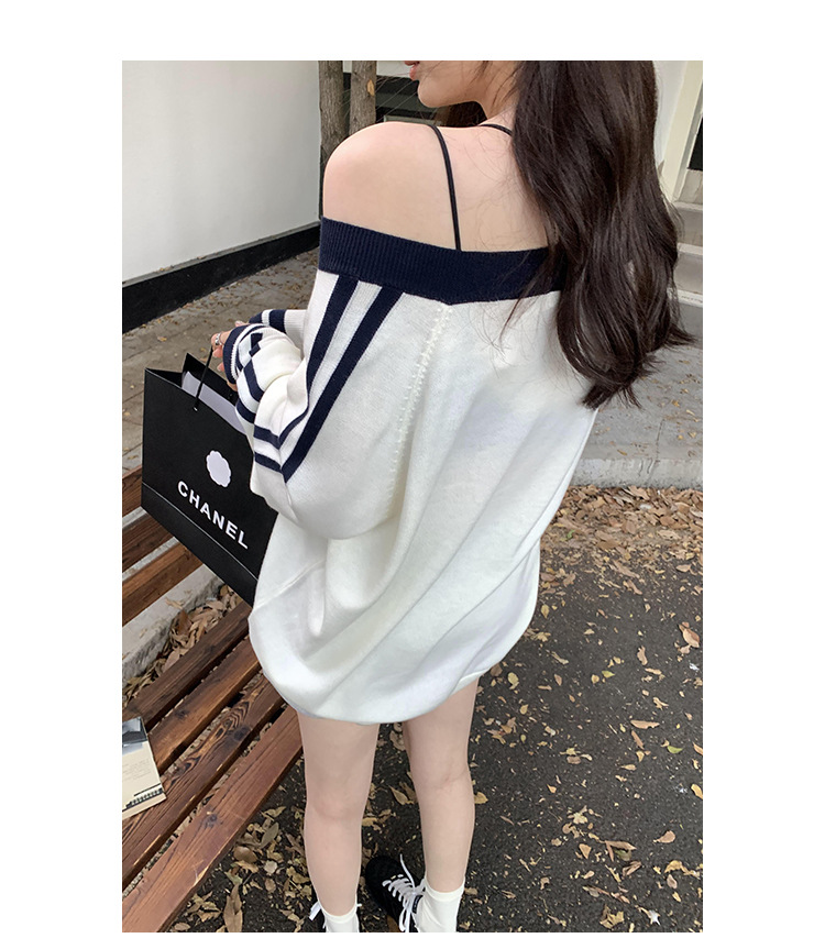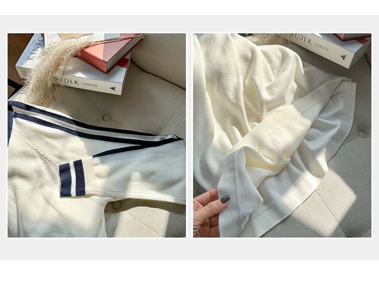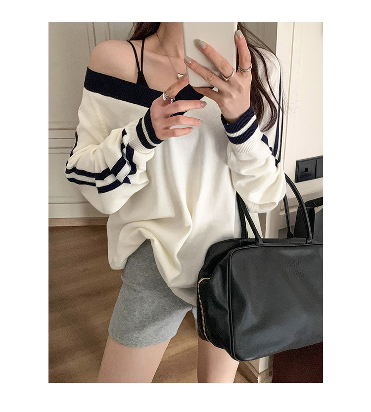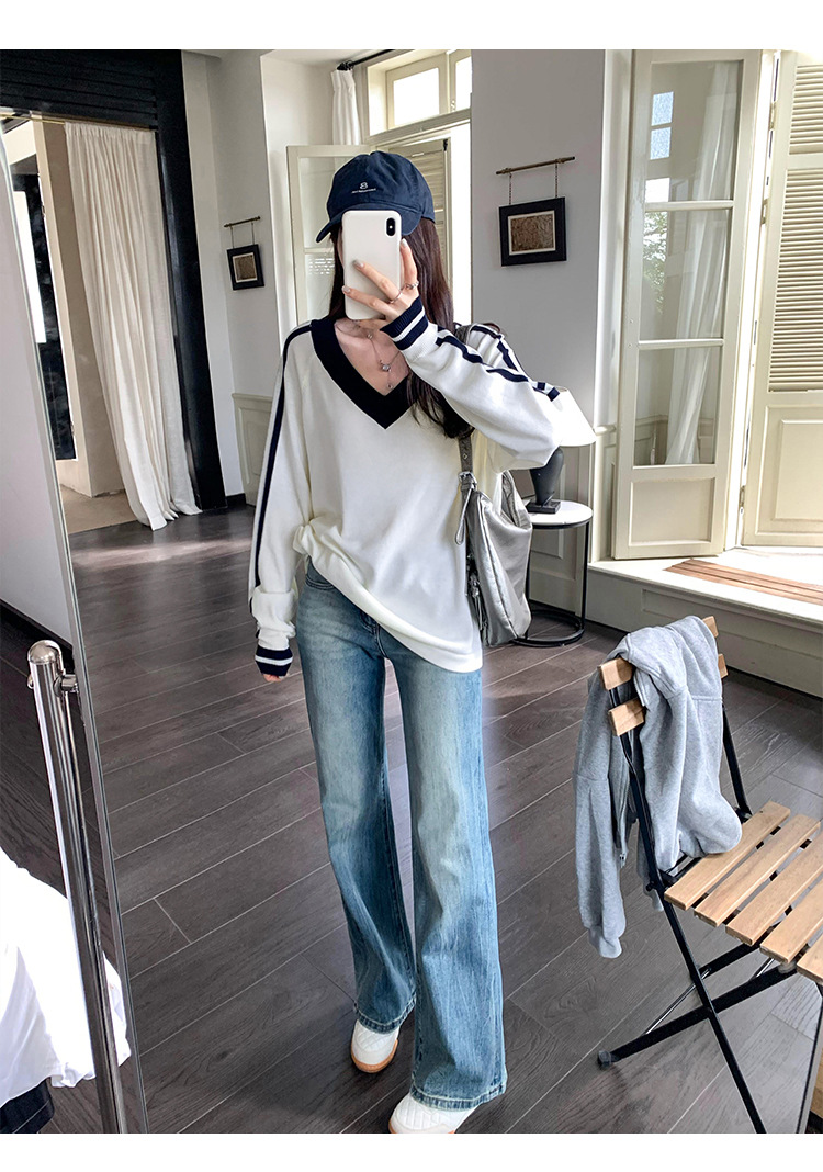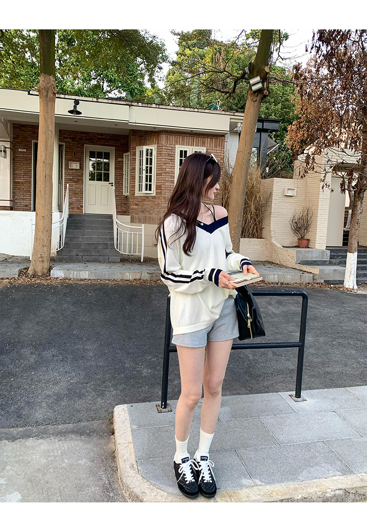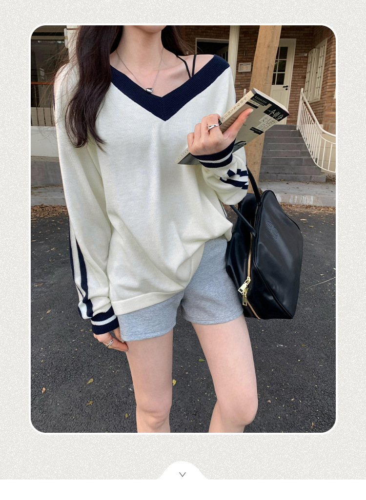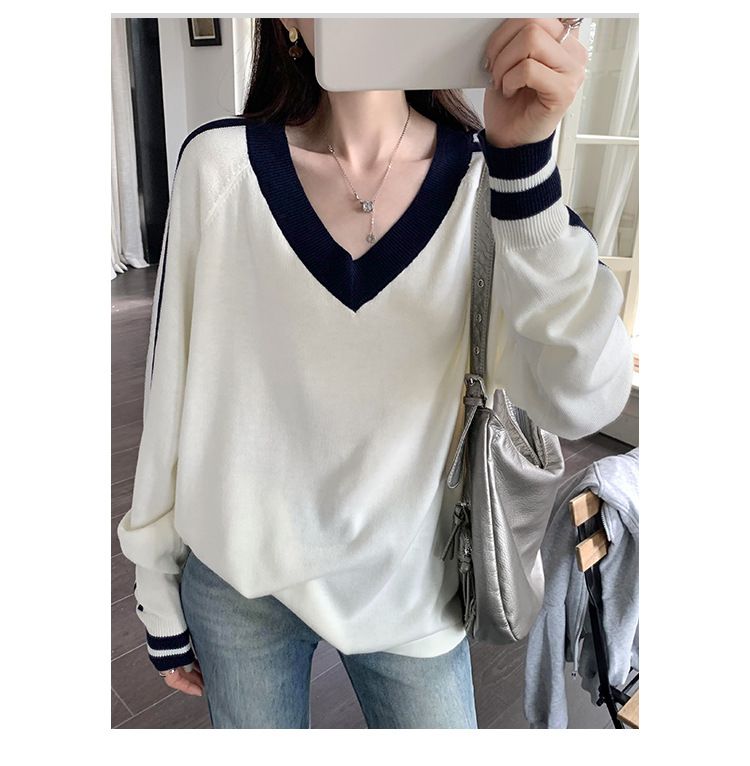 2025实拍图韩系宽松V领撞色条纹羊毛打底衫女秋冬新款设计感气质 English | 投诉
