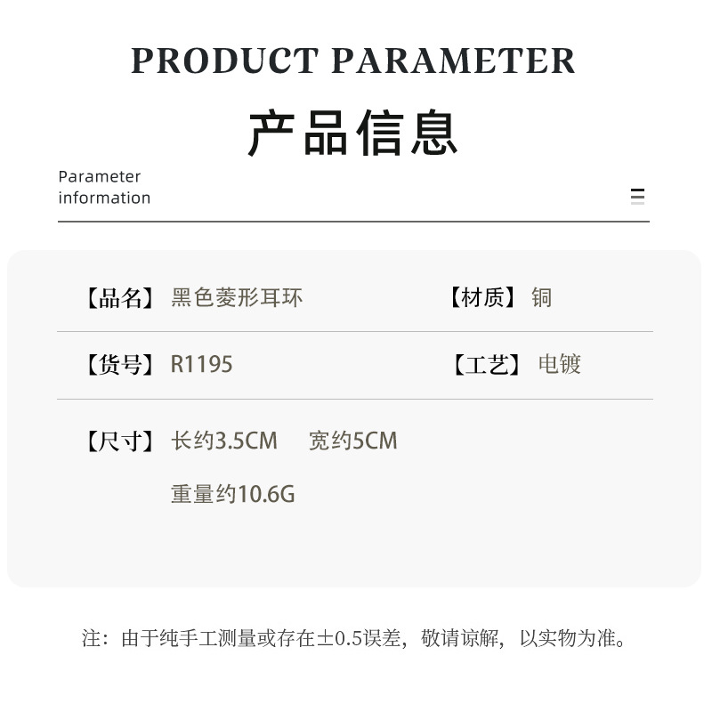 材质: 铜 货号: R1195/1063 品牌: GUSHI 造型: 菱形 处理工艺: 电镀 产地: 金华 主要下游平台: 淘宝,京东,ebay,PDD,亚马逊,w 颜色: R1195 黑色菱形耳环,R1063 有可授权的自有品牌: 否 是否跨境出口专供货源: 是 重量: 0.19 kg/对 装箱信息:长宽高:80X40X50cm 装箱重量: 28KG 装箱数量:600pcs