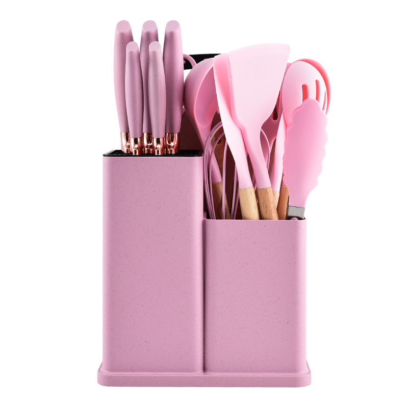 新款木柄硅胶厨具19件套装 炒菜铲子汤勺菜板刀具套装亚马逊爆款
