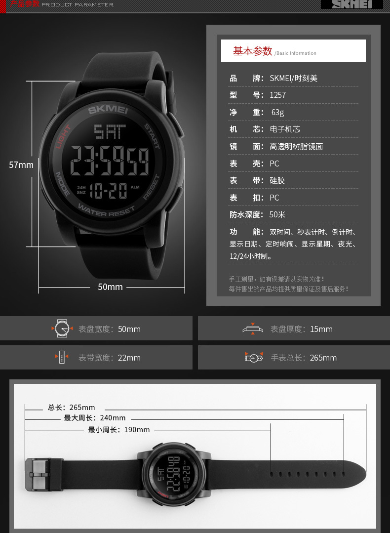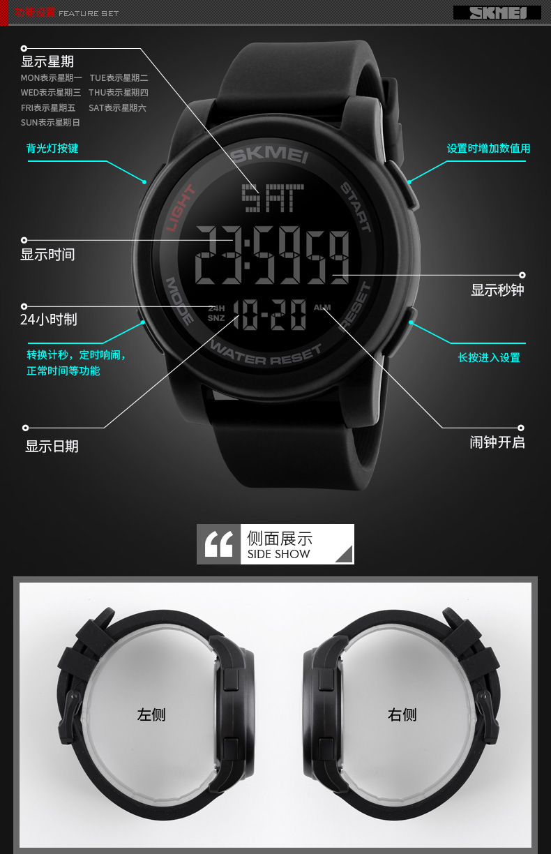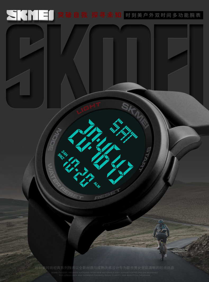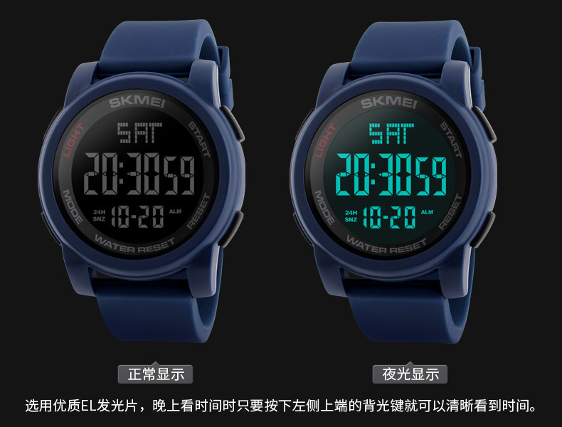 品牌: Skmei/时刻美 特殊功能: 夜光 显示类型: 数字 适用人群: 通用 防水: 可以 防水性能: 50m 机芯种类: 电子 机芯产地: 中国 机芯型号: 000 表盘直径: 50mm及以上 重量: 0.19 kg/个 装箱信息:长宽高:80X40X50cm 装箱重量: 28KG 装箱数量:600pcs