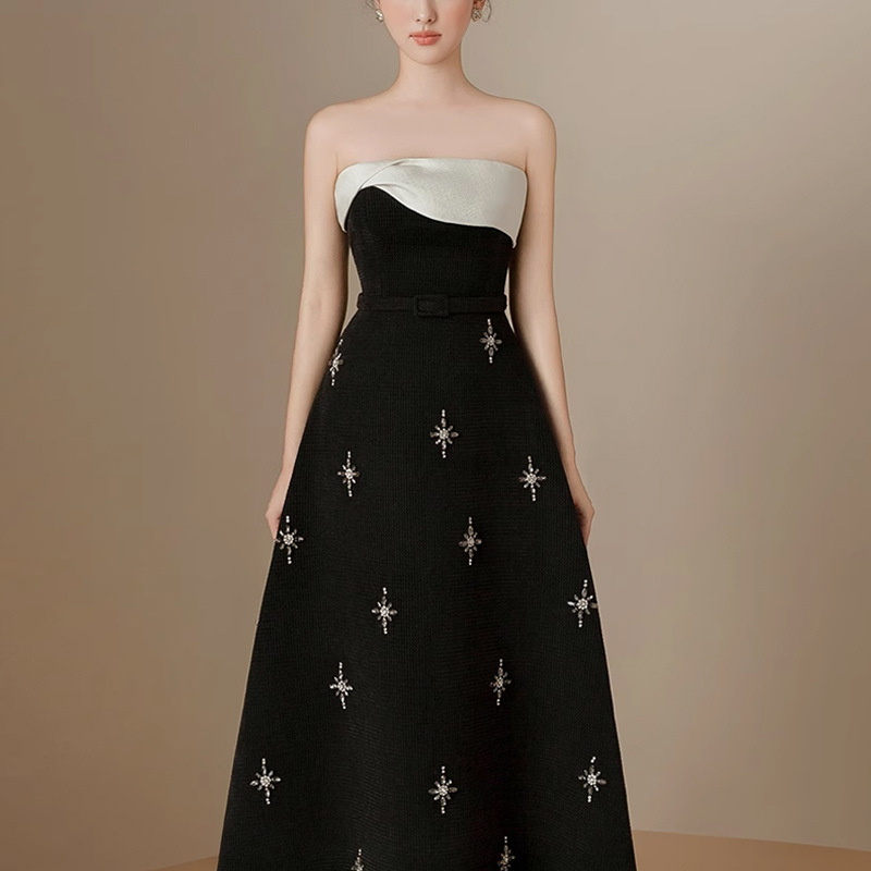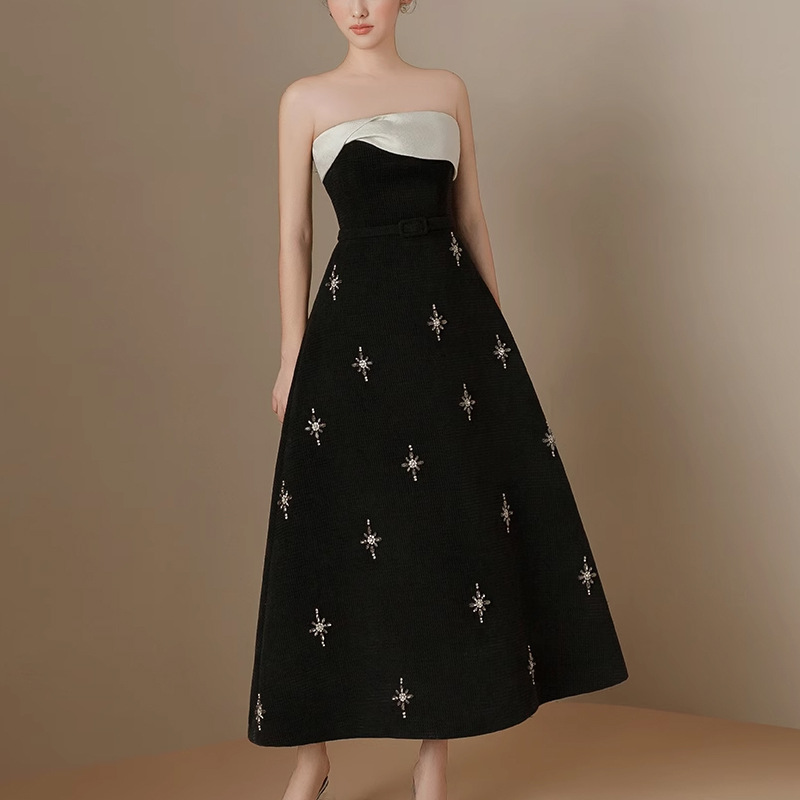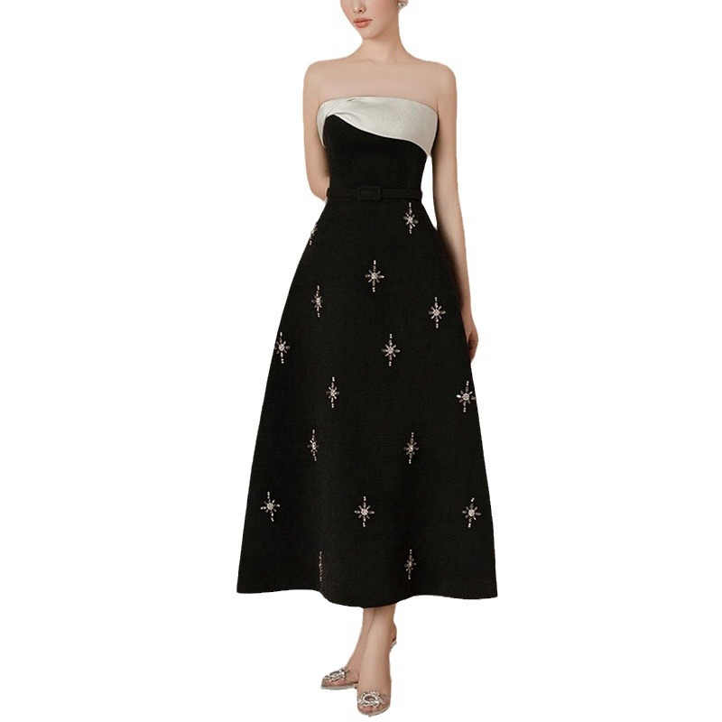 小众品牌撞色礼服裙抹胸印花星星优雅风连衣裙