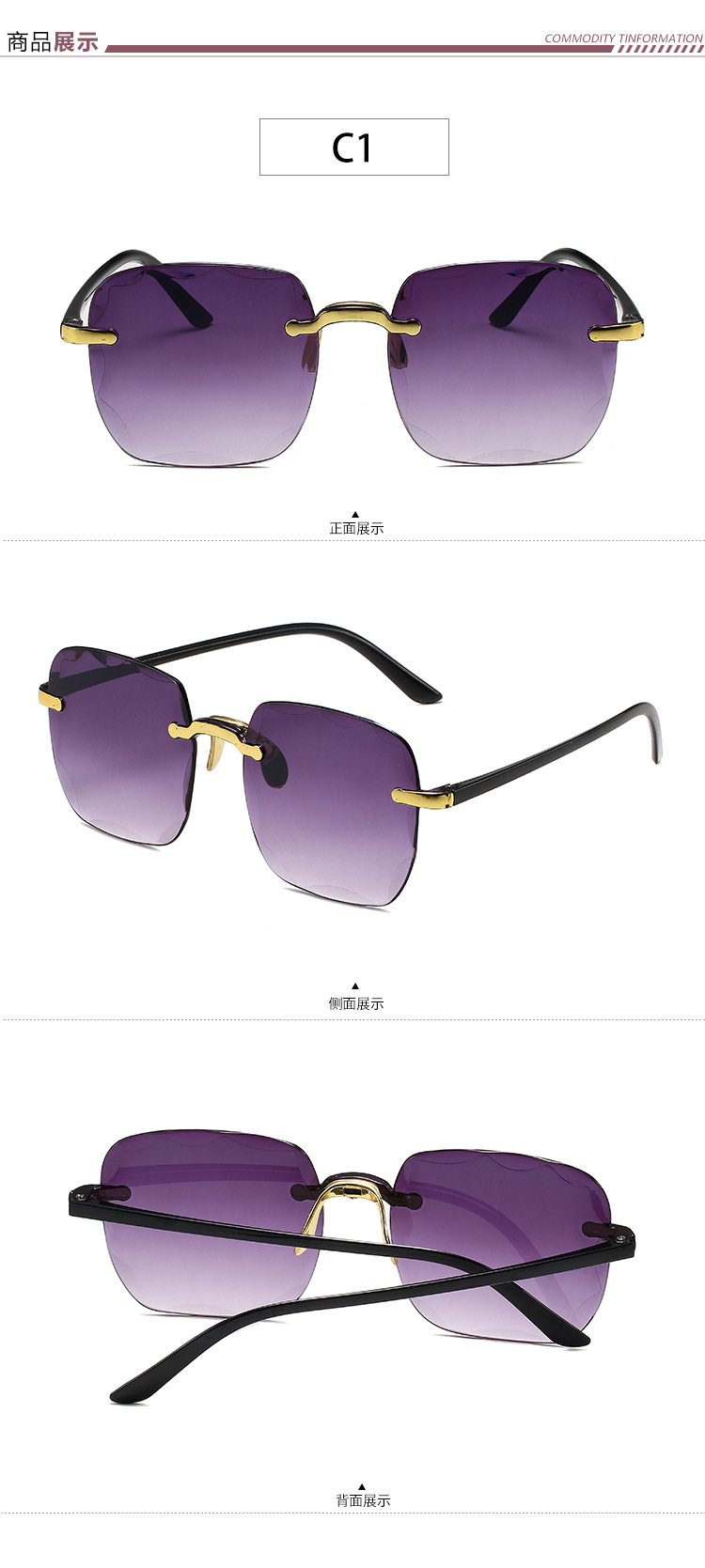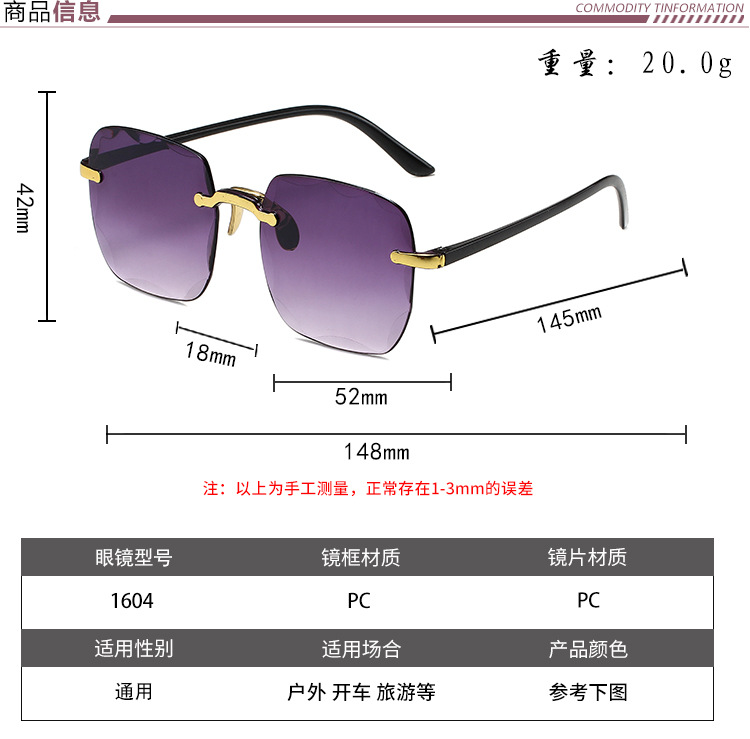 货号: 1604 透射比分类: 2类/遮阳镜 是否偏光: 否 眼镜结构: 无框 抗UV等级: UV380 上市年份/季节: 2023年夏季 产地: 台州 镜片材质: PC 镜框材质: 塑料 眼镜款式: 方框 重量: 0.5 kg/副 装箱信息:长宽高:10X10X10cm 装箱重量: 1KG 装箱数量:5pcs