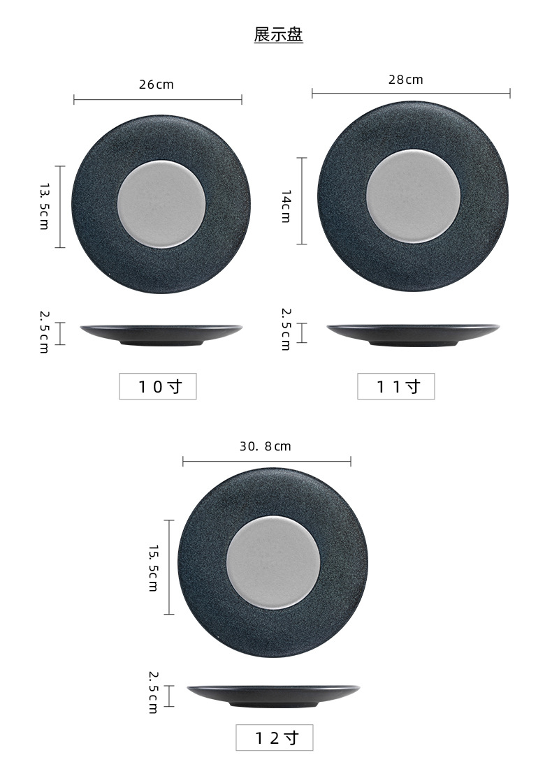 品牌: 青圆陶瓷 货号: 大明灰、黑钧花 产品类别: 盘 材质: 强化瓷 是否进口: 否 适用人群: 成人 图案: 纯色 风格: 北欧风 形状: 圆形 微波炉: 可用